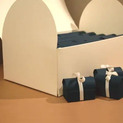 Composizione di scatole da confezione: baulone grande con all'interno scrignetti porta confetti. Diverse opzioni disponibili con quantità differenti di scrignetti. Gli scrignetti sono disponibili in diversi colori .