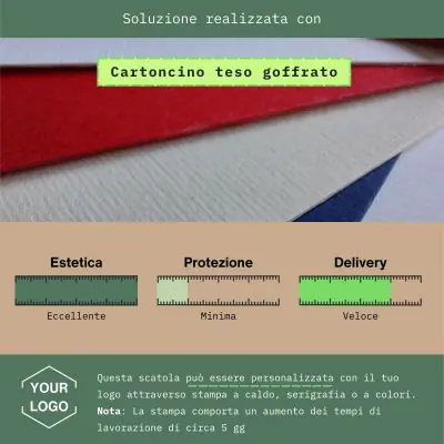 Inoltre la goffratura fa sì che la superficie esterna non sia liscia (escluso i colori sabbia e ghiaccio che sono invece lisci) donandogli una particolare ruvidità, che la rende al tatto e all'occhio molto diversa da quella di tanti altri prodotti verniciati di qualità inferiore. Con queste caratteristiche la scatola sarà molto ben rifinita e adatta all'uso come confezione.