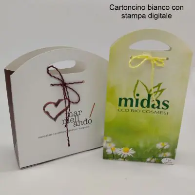 Si può chiudere facilmente con un piccolo nastrino (non fornito) è formando un bel pacchetto regalo. Principalmente utilizzata nei negozi di abbigliamento e oggettistica, ma anche come bomboniera.