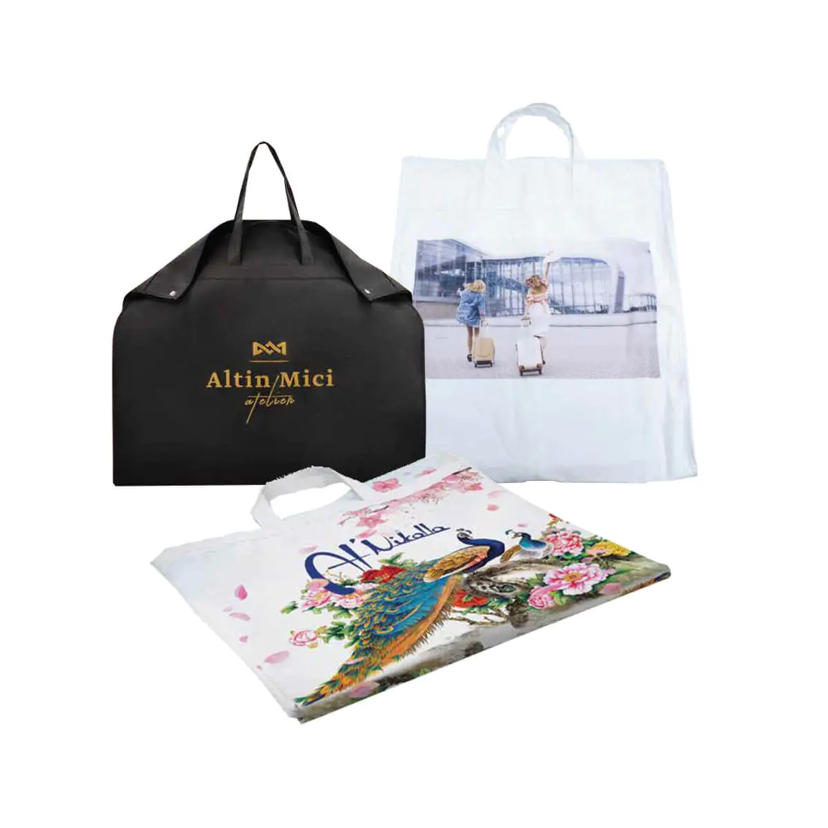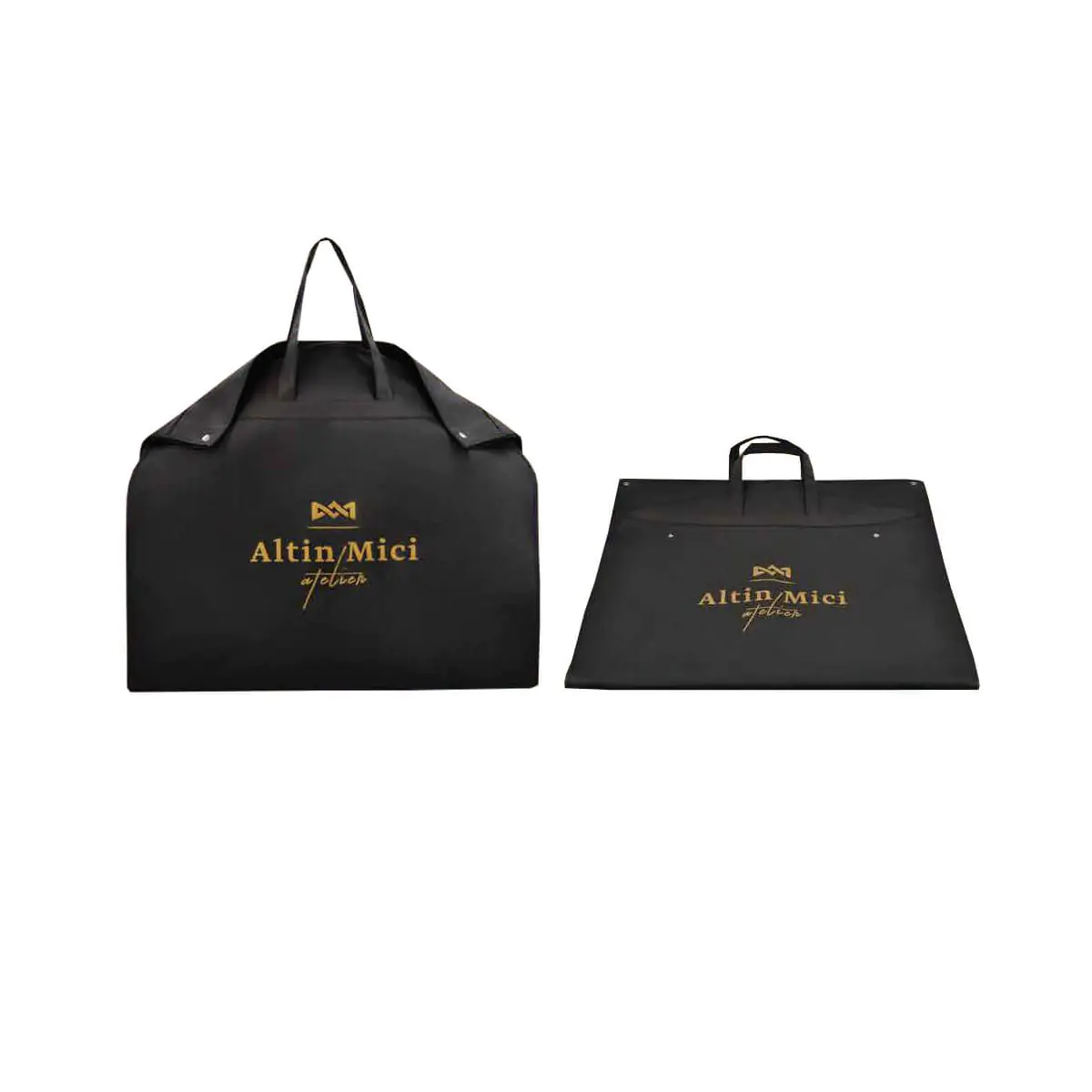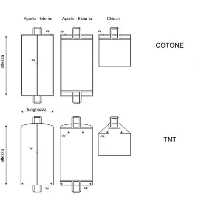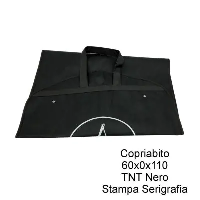 Busta copriabito in tessuto TNT o Cotone 100%. La busta è dotata di lunga lampo per chiudere all'interno l'abito e comode maniglie per il trasporto. Personalizzabile con stampa ad un colore o in quadricromia anche per pochi pezzi.