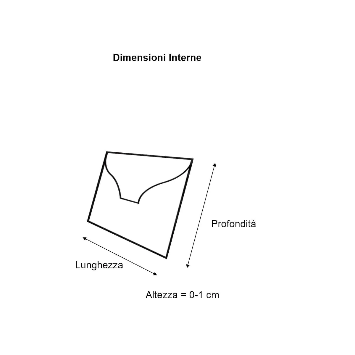 | Dimensioni | Le dimensioni sono in cm e si riferiscono a quelle interne. Convenzione: le prime due sono quelle di base(lunghezza x profondià), la terza è l'altezza. N.B.: per le dimensioni disponibili non si paga la fustella |