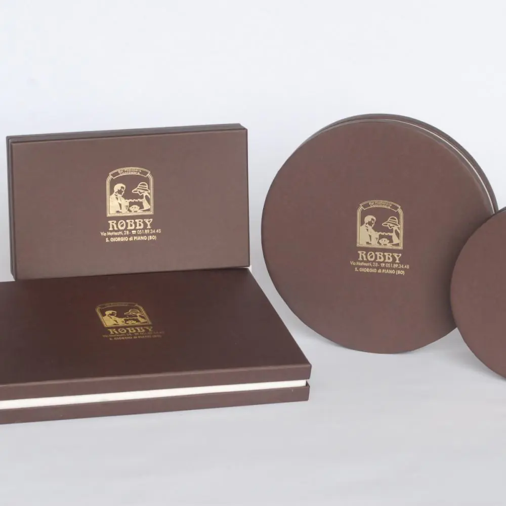 Scatola in cartone, Fondo e Coperchio, base rotonda (forma cilindrica) a struttura rigida. Fornita già montata, pronta per l'uso. Struttura robusta ed elegante, ideale per confezioni importanti.
