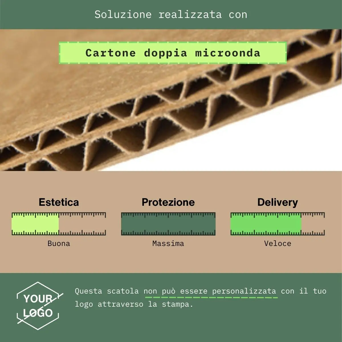 Questo prodotto è in cartone ondulato, un materiale che consente di avere tante caratteristiche importanti per il packaging: elevata resistenza, robustezza, capacità di carico e di protezione dagli urti.