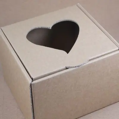 Scatola automontante con coperchio annesso (apertura a libro) e chiusura ad incastro, in color sabbia (o avana, colore del cartone non verniciato).