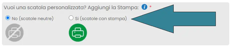 Dopo aver scelto dimensioni e colore della scatola, puoi aggiungere la stampa: dopo "Vuoi una scatola personalizzata? Aggiungi la Stampa: " seleziona: "Si (scatole con stampa)".