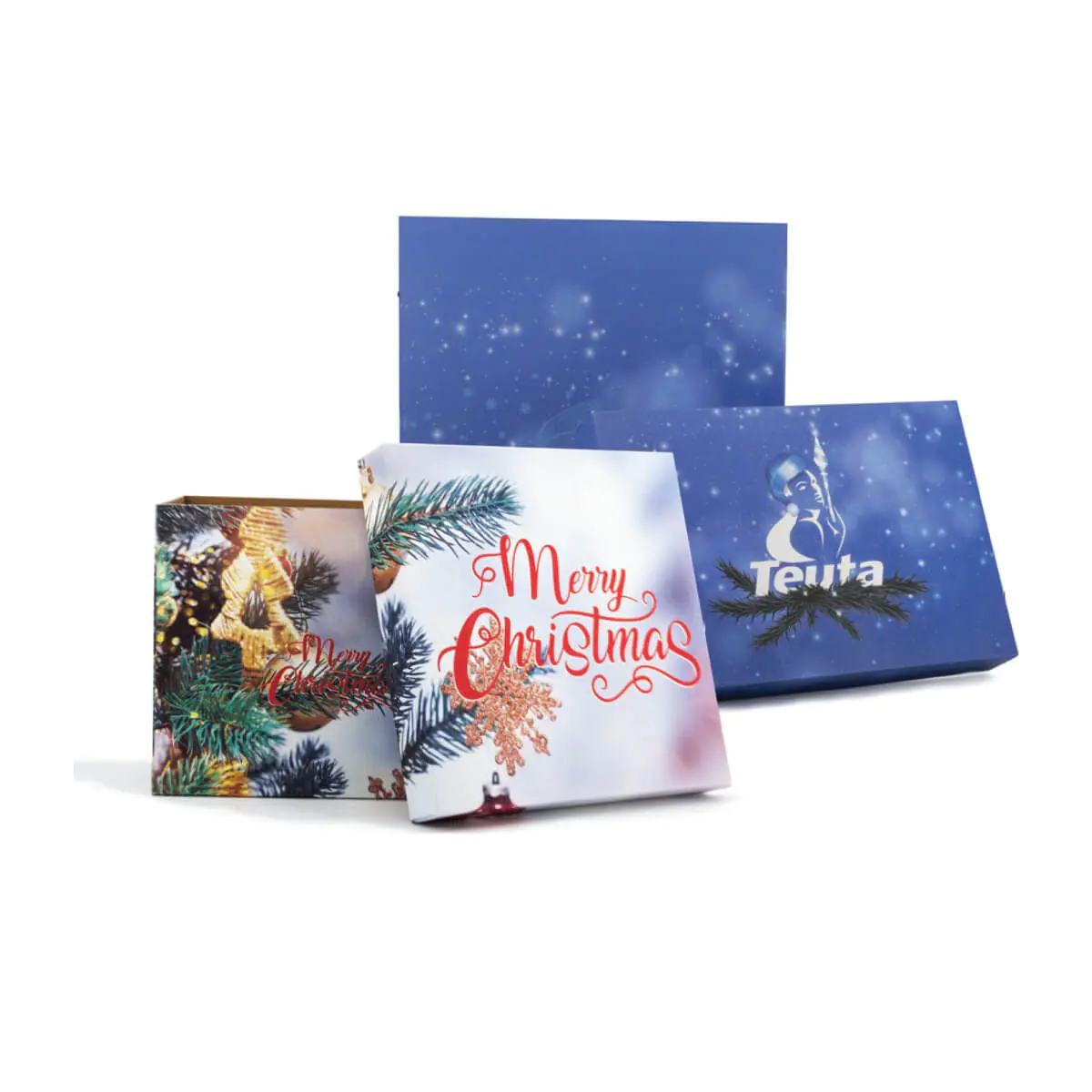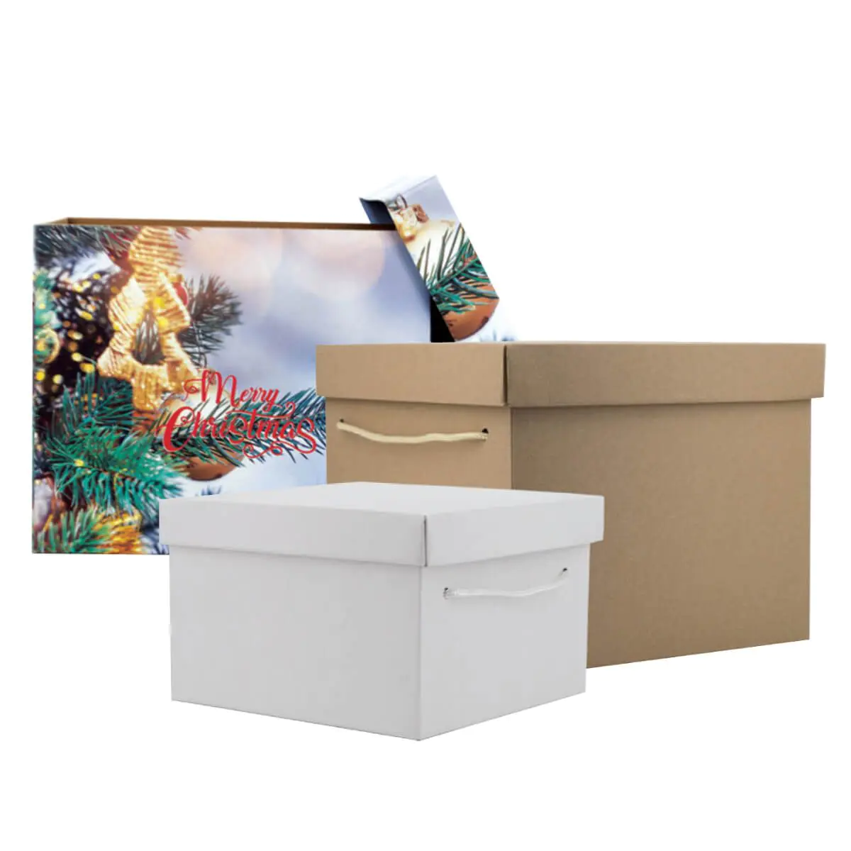 Scatole da confezione regalo fondo e coperchio. Robuste in cartone microonda e molto capienti, per confezionare grandi volumi come strenne natalizie. Dotate di maniglie in tinta per un più agevole trasporto.