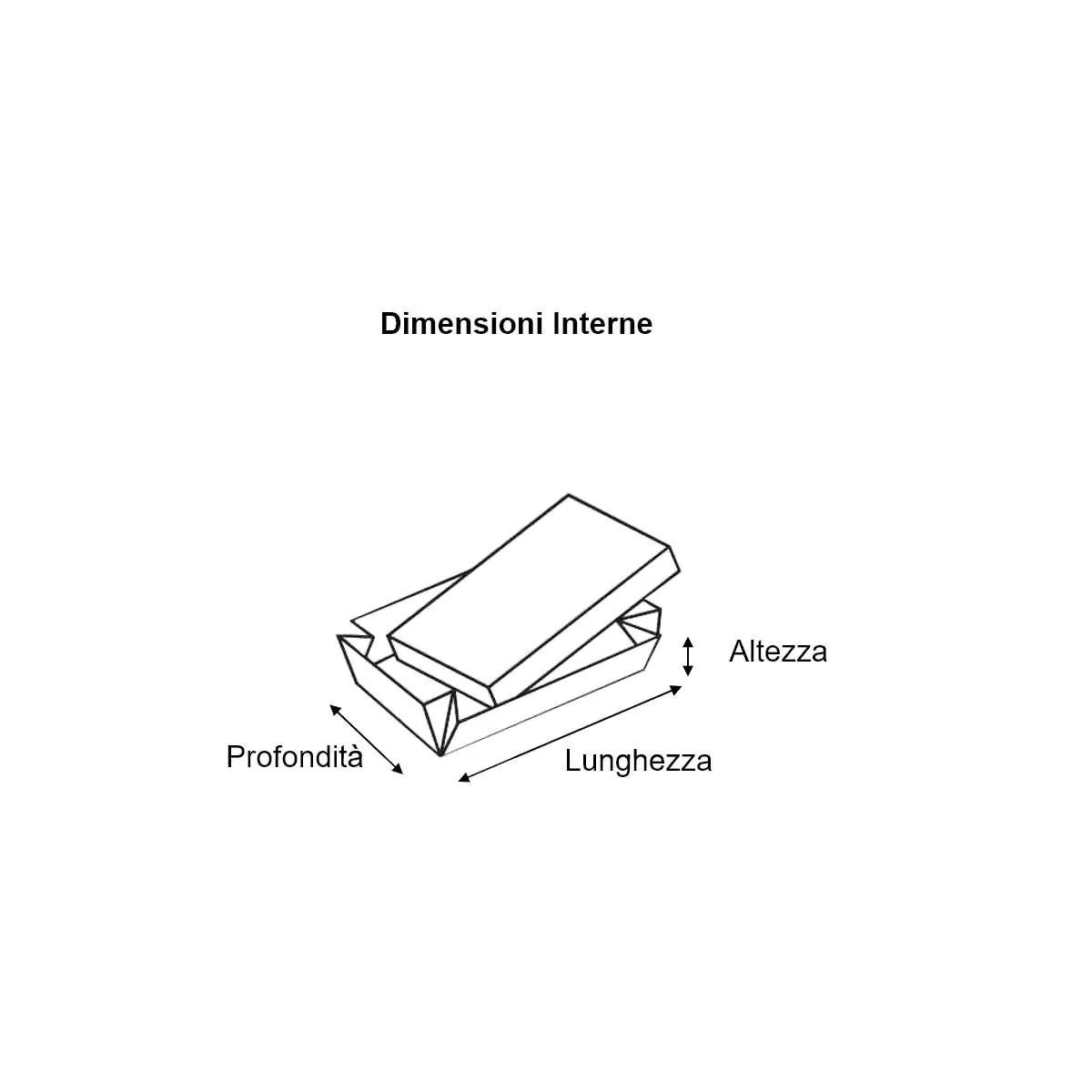| Dimensioni | Le dimensioni sono in cm e si riferiscono a quelle interne. Convenzione: le prime due sono quelle di base(lunghezza x profondià), la terza è l'altezza. La scelta è tra le dimensioni a catalogo |