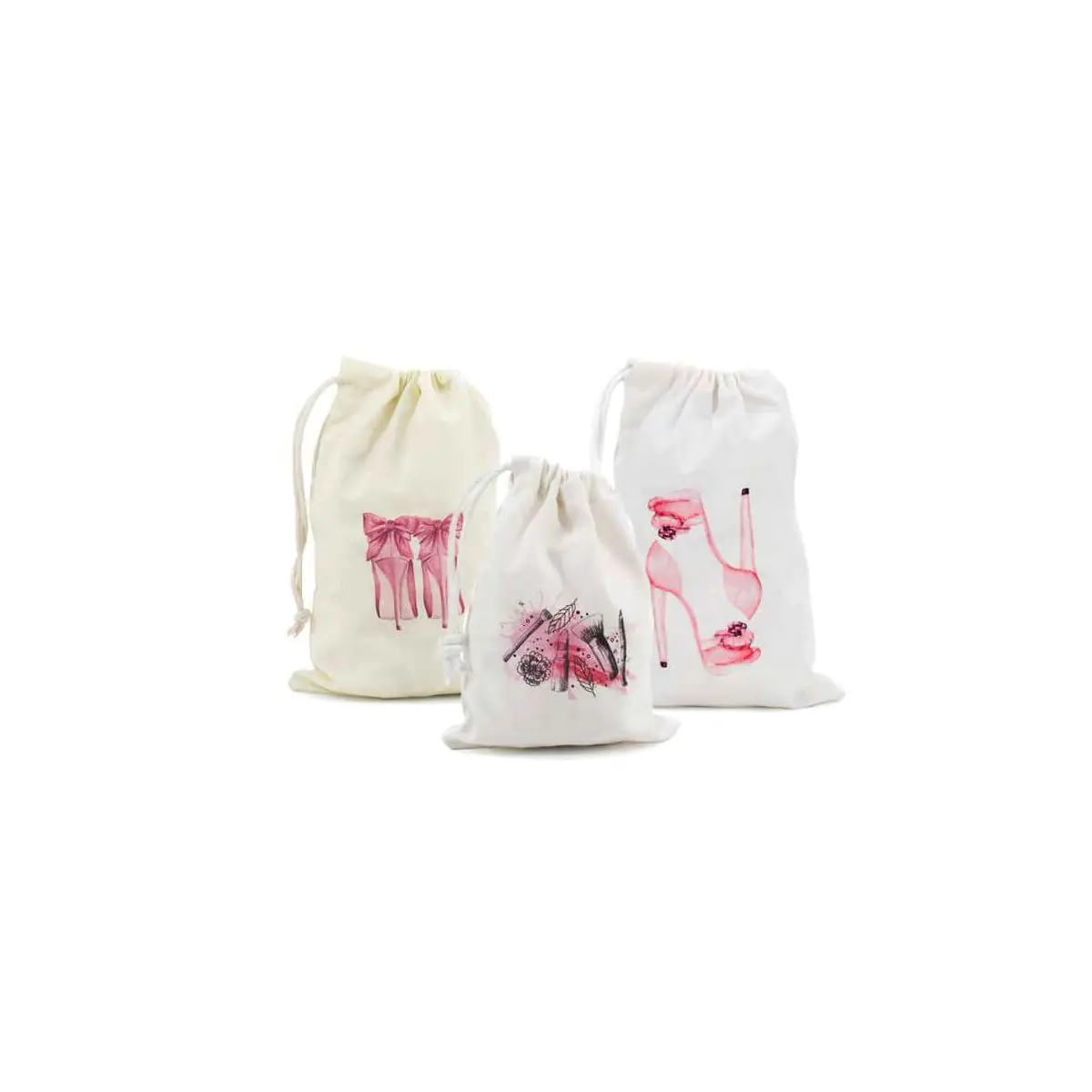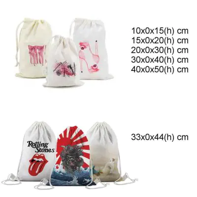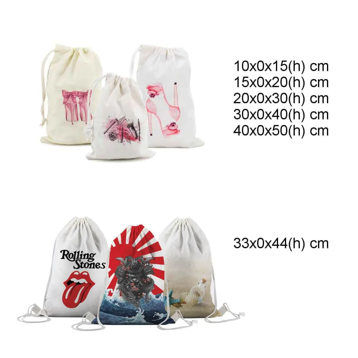 Le sacche (dimensioni 10x0x15, 10x0x20, 20x0x30, 30x0x40, 40x0x50) sono chiuse in alto con cordino con cucitura artigianale modello L a cordino singolo in cotone da 3 mm.