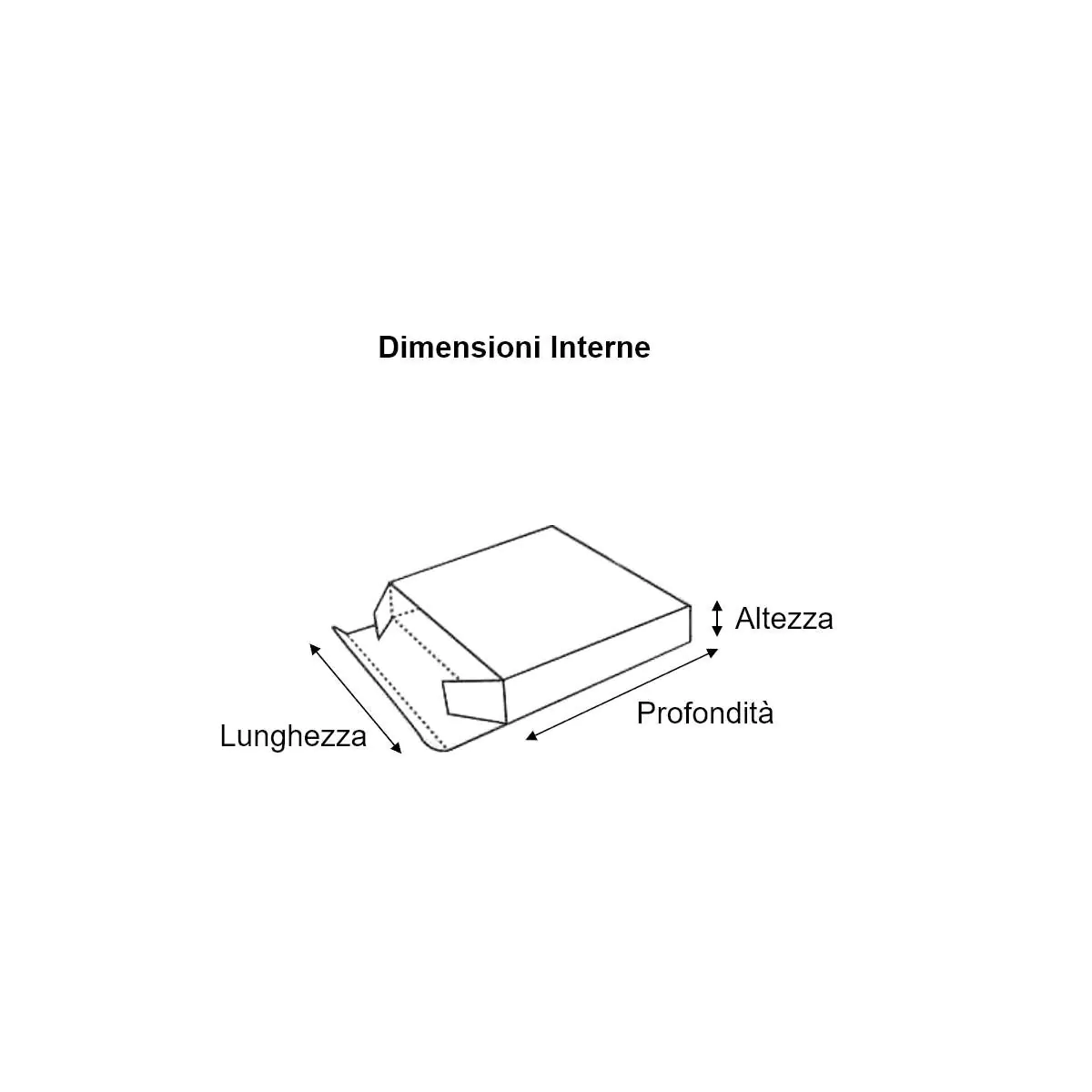 | Dimensioni | Le dimensioni sono in cm e si riferiscono a quelle interne. Convenzione: le prime due sono quelle di base(lunghezza x profondià), la terza è l'altezza. N.B.: per le dimensioni disponibili non si paga la fustella |