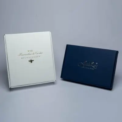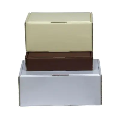 Scatole in cartone microonda (2 mm di spessore). Tutti i colori, esclusi i sabbia, bianco patinato e ghiaccio, sono accoppiati a carte colorate pregiate tinta unita goffrato a righe. Il colore Ghiaccio è bianco plastificato lucido liscio. Il cartone accoppiato è indicato se l'uso della scatola è per confezione. I colori non accoppiati sono più economici, a seguire i colori chiari (bianco e avorio).
