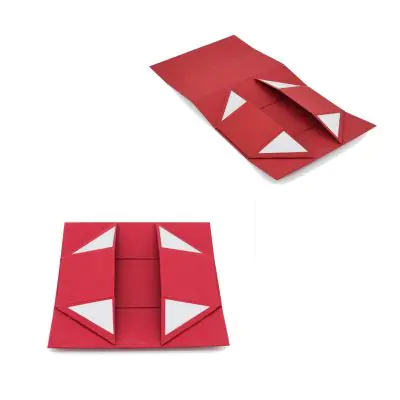 Scatola in cartoncino accoppiato a carta pregiata in pasta Burano-Favini da 90 gr. Struttura rigida con base pieghevole. Montaggio veloce, biadesivi già presenti e incollati in un lato, permettono una maggiore tenuta della struttura. La chiusura è assicurata da calamite montate sulla base e sul coperchio e ricoperte da foglio di carta in tinta con la scatola.