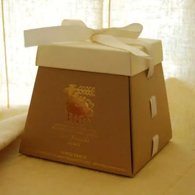 Scatola di forma e confezionamento particolare: piramide troncata con un nastro da confezione infilato in apposite guide e si chiude sopra il coperchio.