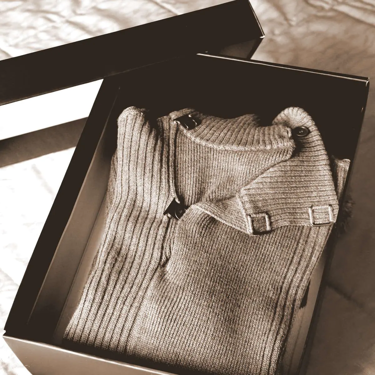 Scatola da confezione di grandi dimensioni fondo e coperchio alto molto robusta. Due "gusci" uno sull'altro di cartone a microonda con doppia ripegatura nelle pareti laterali (4 mm di spessore circa) che garantiscono protezione e resistenza. Il cartone è accoppiato (escluso il sabbia) con cartoncino pregiato goffrato righe tinta unita, che garantisce alla confezione alta qualità e rifinitura.