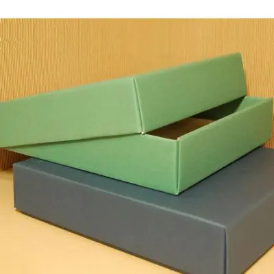 Scatole in cartone microonda (2 mm di spessore). Tutti i colori, escluso il sabbia e il ghiaccio, sono accoppiati a carte colorate pregiate tinta unita goffrato a righe. Il colore Ghiaccio è bianco plastificato lucido liscio. Il cartone accoppiato è indicato se l'uso della scatola è per confezione. I colori non accoppiati sono più economici, a seguire i colori chiari (bianco e avorio).