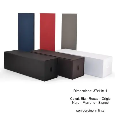 Scatola da confezione per una bottiglia di dimensioni standard, vino, spumante o olio. Dimensioni esterne: 37x11x11(h) cm.