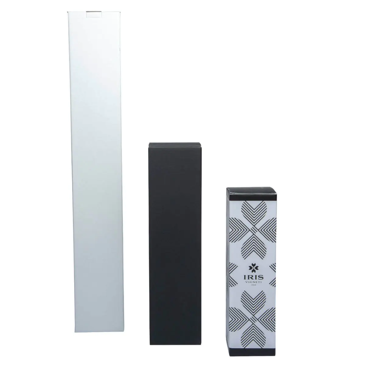 Scatole in cartone microonda (2 mm di spessore). Tutti i colori, escluso il sabbia (avana), sono accoppiati a carte colorate pregiate tinta unita goffrato a righe. Il cartone accoppiato è indicato se l'uso della scatola è per confezione. I colori non accoppiati sono più economici, a seguire i colori chiari (bianco e avorio). Modello pieghevole con coperchio annesso e chiusura ad incastro.