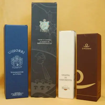 Scatola per confezionare bottiglie. Molto ben rifinita, in cartone microonda accoppiato con carta pregiata goffrato a righe. Molti formati disponibili che permettono moltissime esigenze di confezionamento: vino, birra, olio, grappe, liquori, profumi e cosmetici.