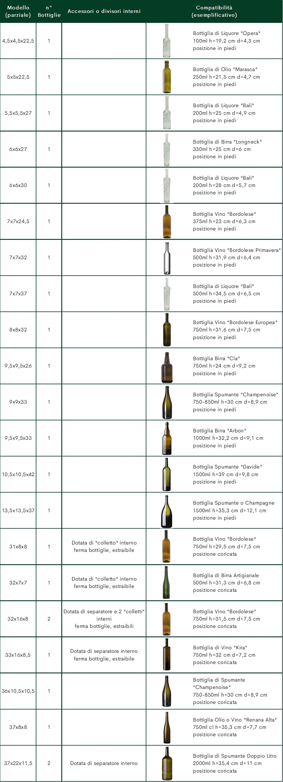 Tanti formati disponibili per le più svariate tipologie di bottiglie di vino, birra, liquori, distallati o barattoli. In funzione delle dimensioni, sono compatibili con l'alloggio di 1-3 bottiglie coricate o in piedi.