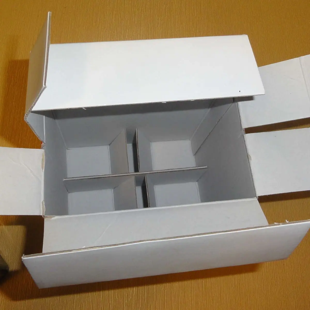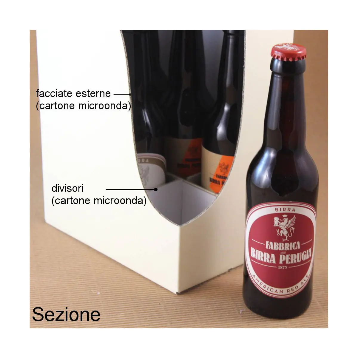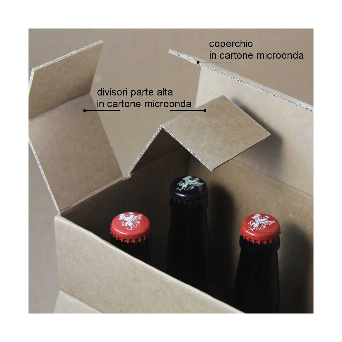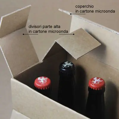 Packaging molto resistente robusto ma anche ben rifinita, adatta ad uso confezione. Dotato di separatori interni che non permettono alle bottiglie di toccarsi una con l'altra garantendo una maggiore resistenza agli urti.