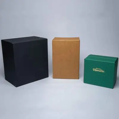 Scatole in cartone microonda (2 mm di spessore). Tutti i colori, escluso il sabbia (avana), sono accoppiati a carte colorate pregiate tinta unita goffrato a righe. Il cartone accoppiato è indicato se l'uso della scatola è per confezione. I colori non accoppiati sono più economici, a seguire i colori chiari (bianco e avorio).
