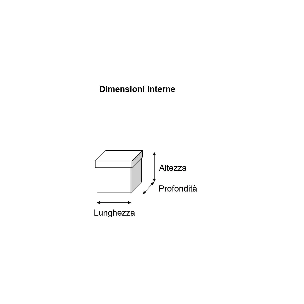 | Dimensioni | Le dimensioni sono in cm e si riferiscono a quelle interne. Convenzione: le prime due sono quelle di base(lunghezza x profondià), la terza è l'altezza. N.B.: per le dimensioni disponibili non si paga la fustella |