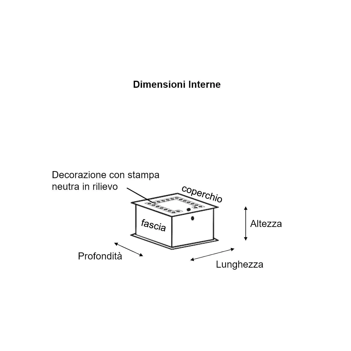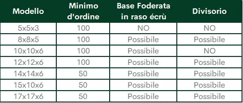 | Materiale | Scatola rigida in cartoncino teso colorato. Possibilità di avere la base foderata in raso écru. |
