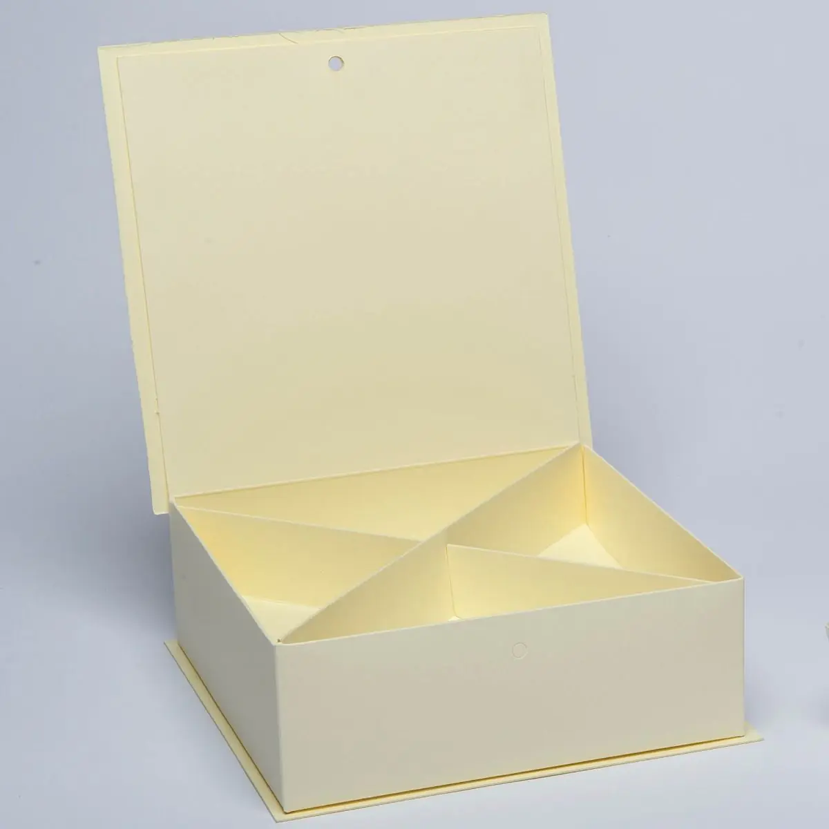 | Accessori Scatole | Possibilità di avere un divisorio interno ad " X " in cartoncino che divide la base in 4 triangoli uguali o la base della scatola foderata in raso ecrù. |