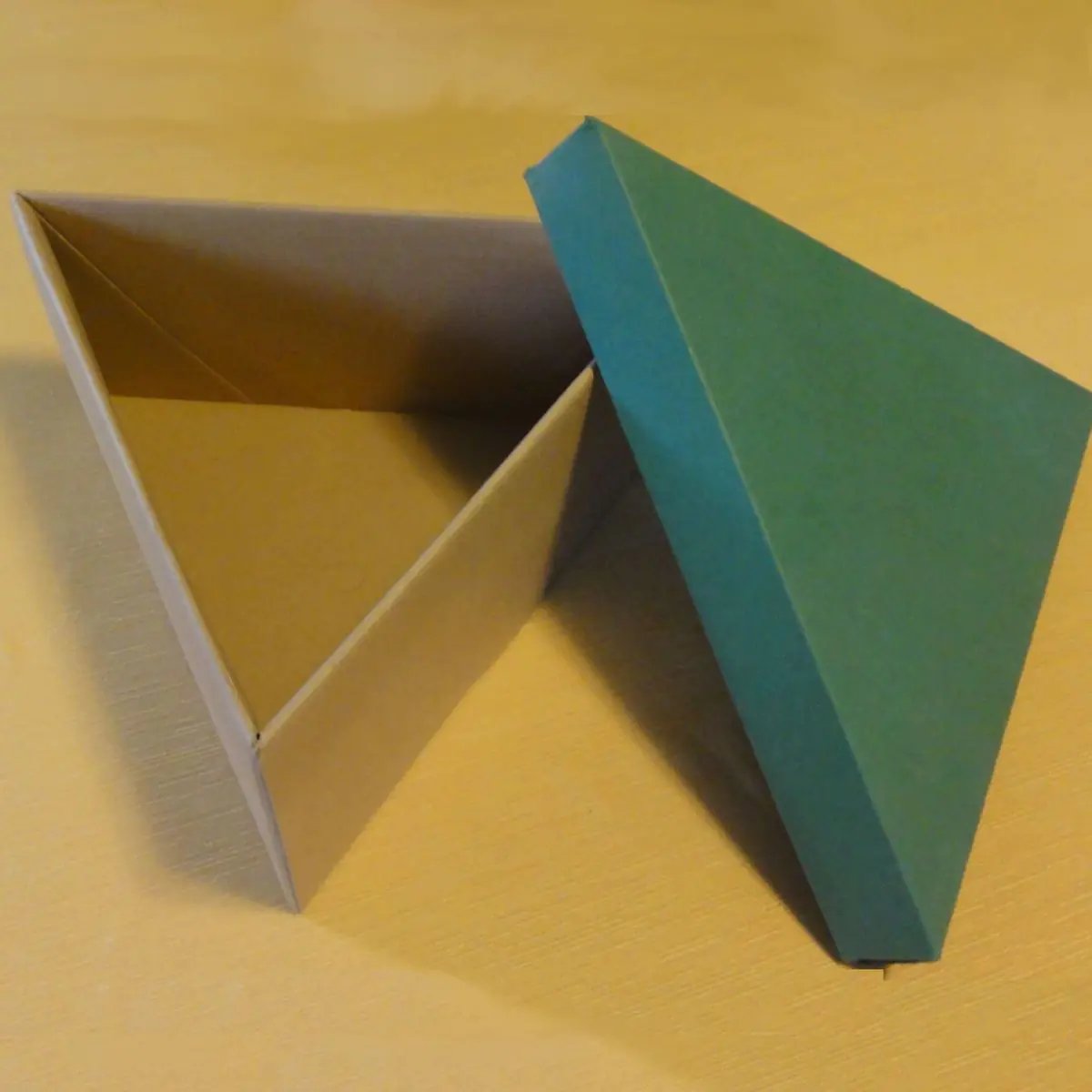 Scatola fondo e coperchio di forma triangolare. Il fondo è color sabbia e il coperchio disponibile in diversi colori. Base con doppia ripiegatura del cartone che, unita alla particolare struttura, rendono la scatola particolarmente robusta.