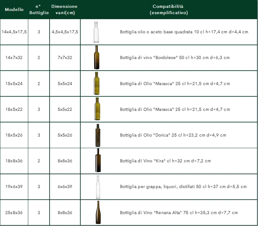 In funzione delle dimensioni, sono compatibili con l'alloggio da 2 a 3 bottiglie di grappa, liquori, distillati, olio o vino. Le dimensioni disponibili nella scelta si riferiscono a quelle interne, manico escluso.