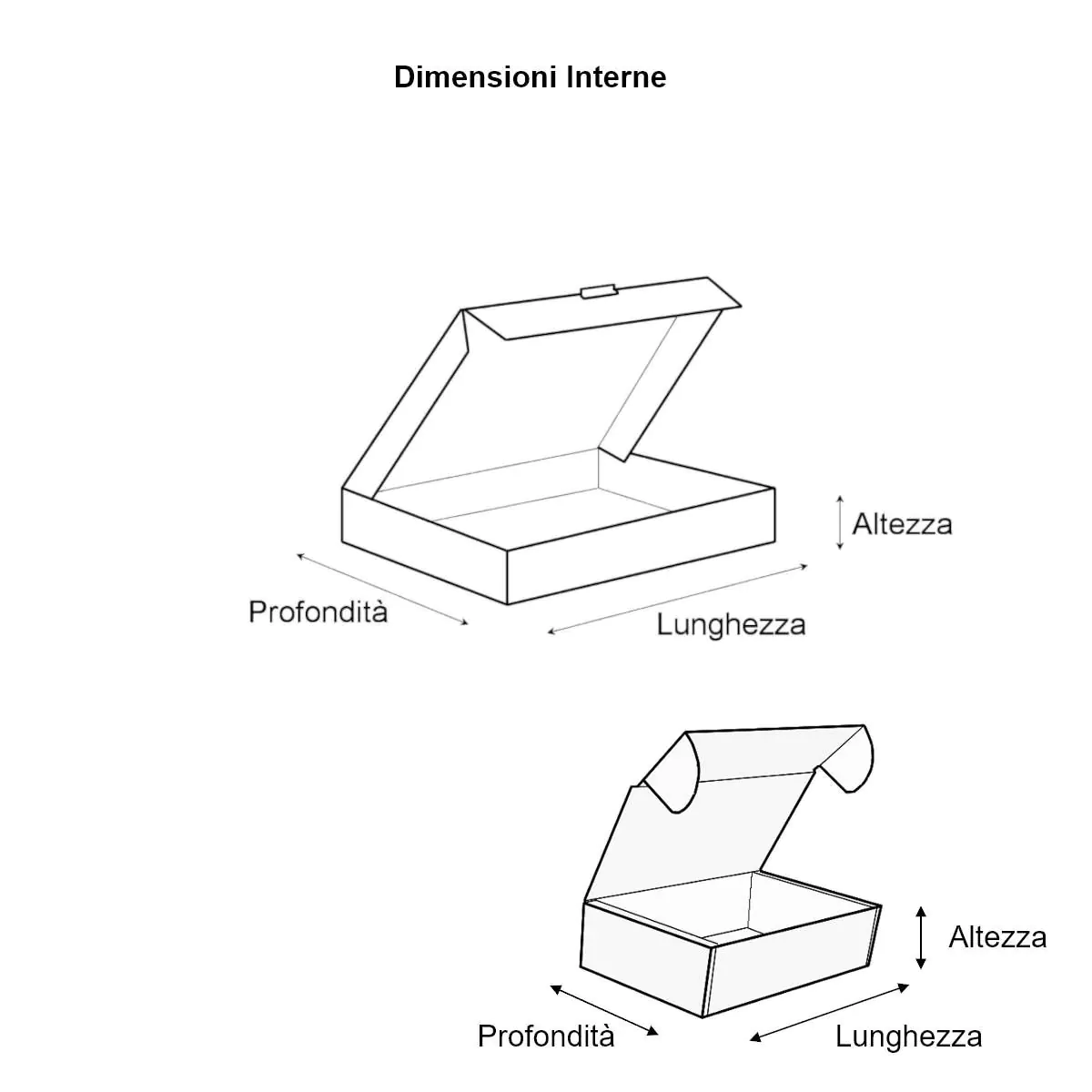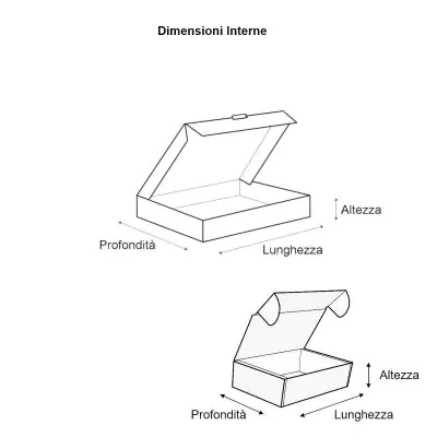 | Dimensioni | Le dimensioni sono in cm e si riferiscono a quelle interne. Convenzione: le prime due sono quelle di base(lunghezza x profondià), la terza è l'altezza. N.B.: per le dimensioni disponibili non si paga la fustella |