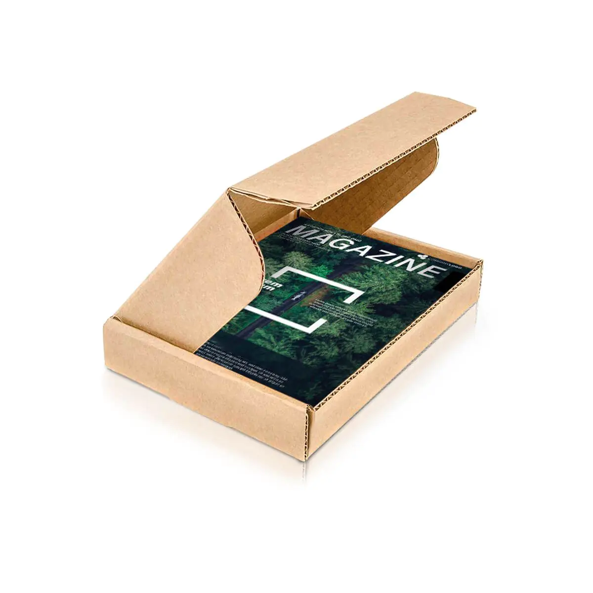 Scatola automontante con coperchio annesso ad apertura a libro. Realizzata in cartone ondulato microonda (2 mm di spessore) o onda bassa (3 mm di spessore) in base alla dimensione scelta. Doppia piegatura laterale, le pareti possono raggiungere uno spessore equivalente di 6-8 mm.
