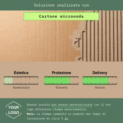 | Materiale | Cartone microonda (2 mm di spessore) o Onda Bassa (3 mm di spessore) in base alle dimensioni scelte. |