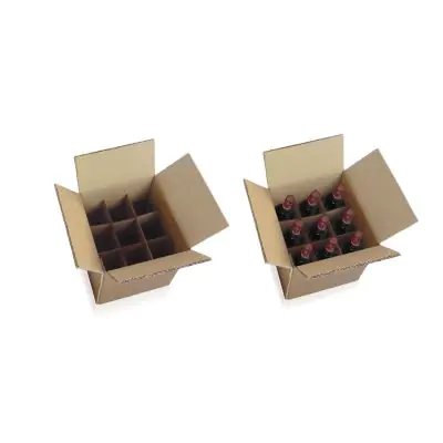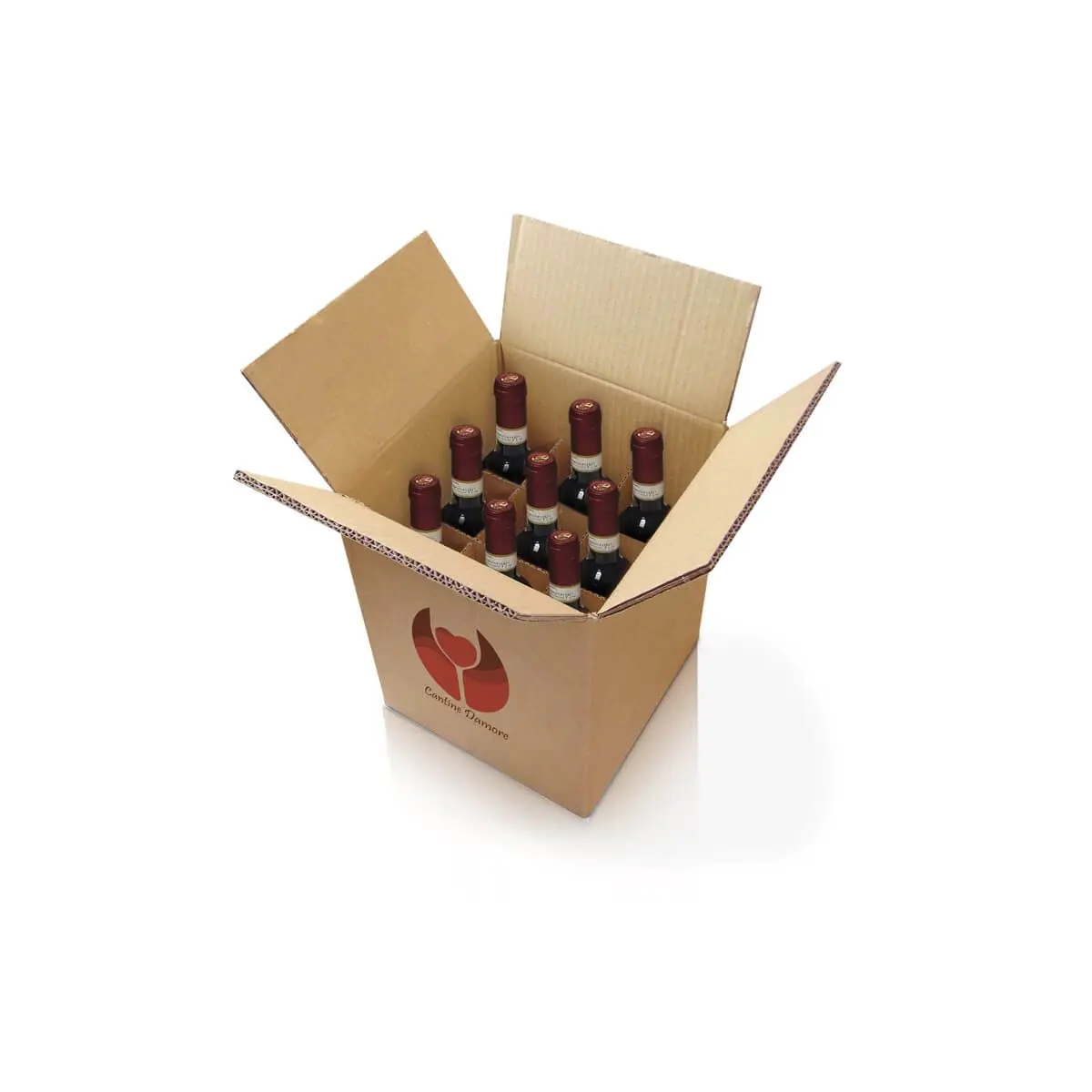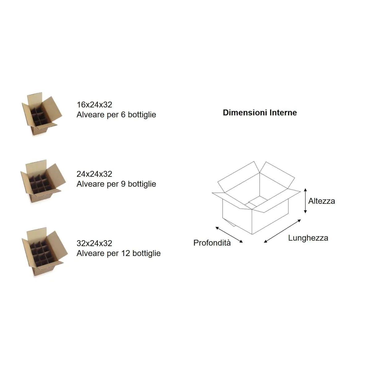 Scatola americana in cartone ondulato onda doppia (alta resistenza, 7 mm di spessore) con alveare interno in onda singola per 4, 6, 9 ,12 bottiglie (in base alla dimensione scelta).