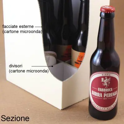 Scatola automontante in cartone microonda (2mm di spessore) sabbia (avana) o bianco patinato. Packaging molto resistente robusto. Dotato di separatori interni che non permettono alle bottiglie di toccarsi una con l'altra garantendo una maggiore resistenza agli urti.