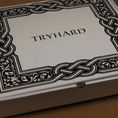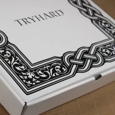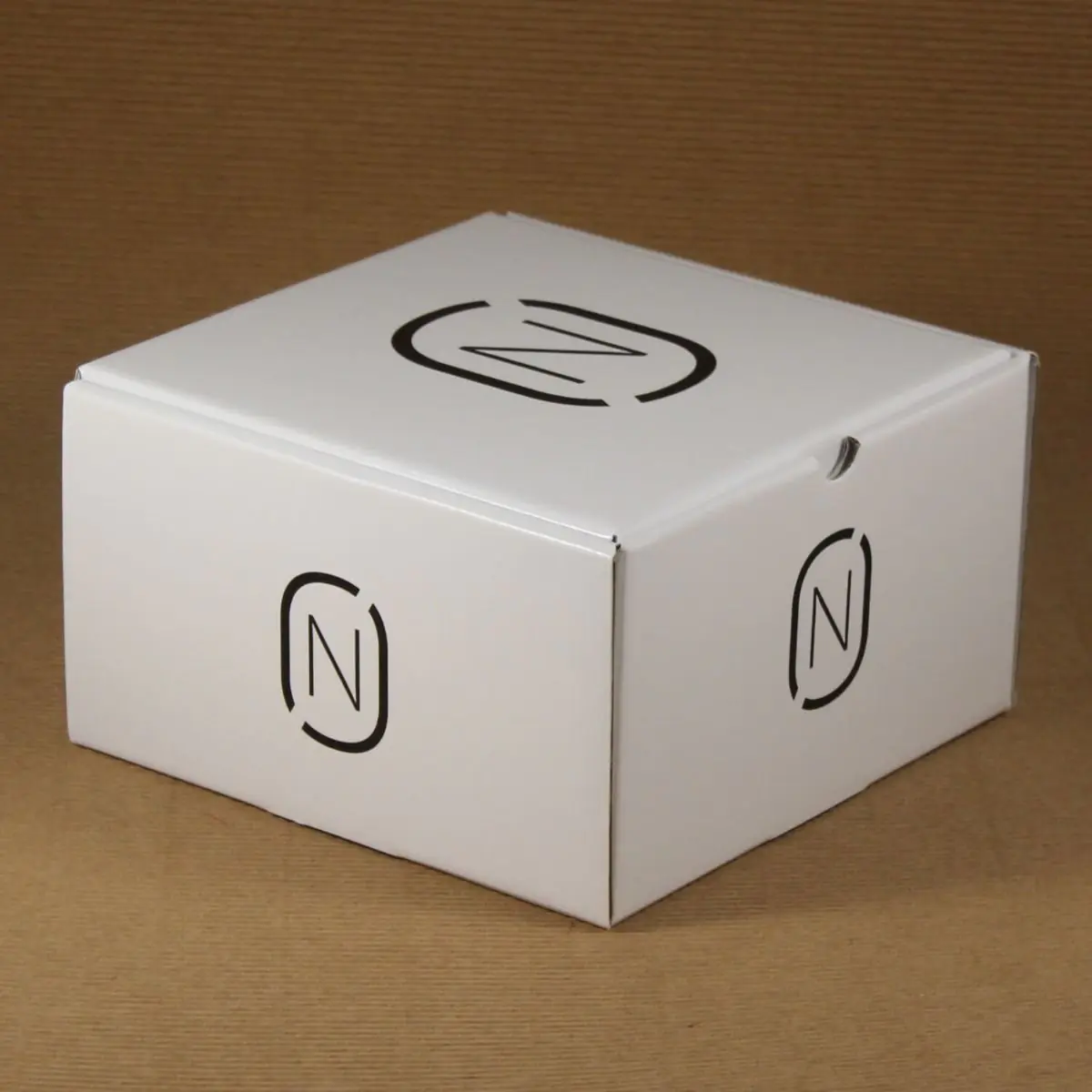Scatole in cartone microonda (2 mm di spessore) bianco con personalizzazione in stampa offset nero. Considerando lo sfondo lucido e il colore della stampa, la personalizzazione si può considerare a due colori, bianco e nero.