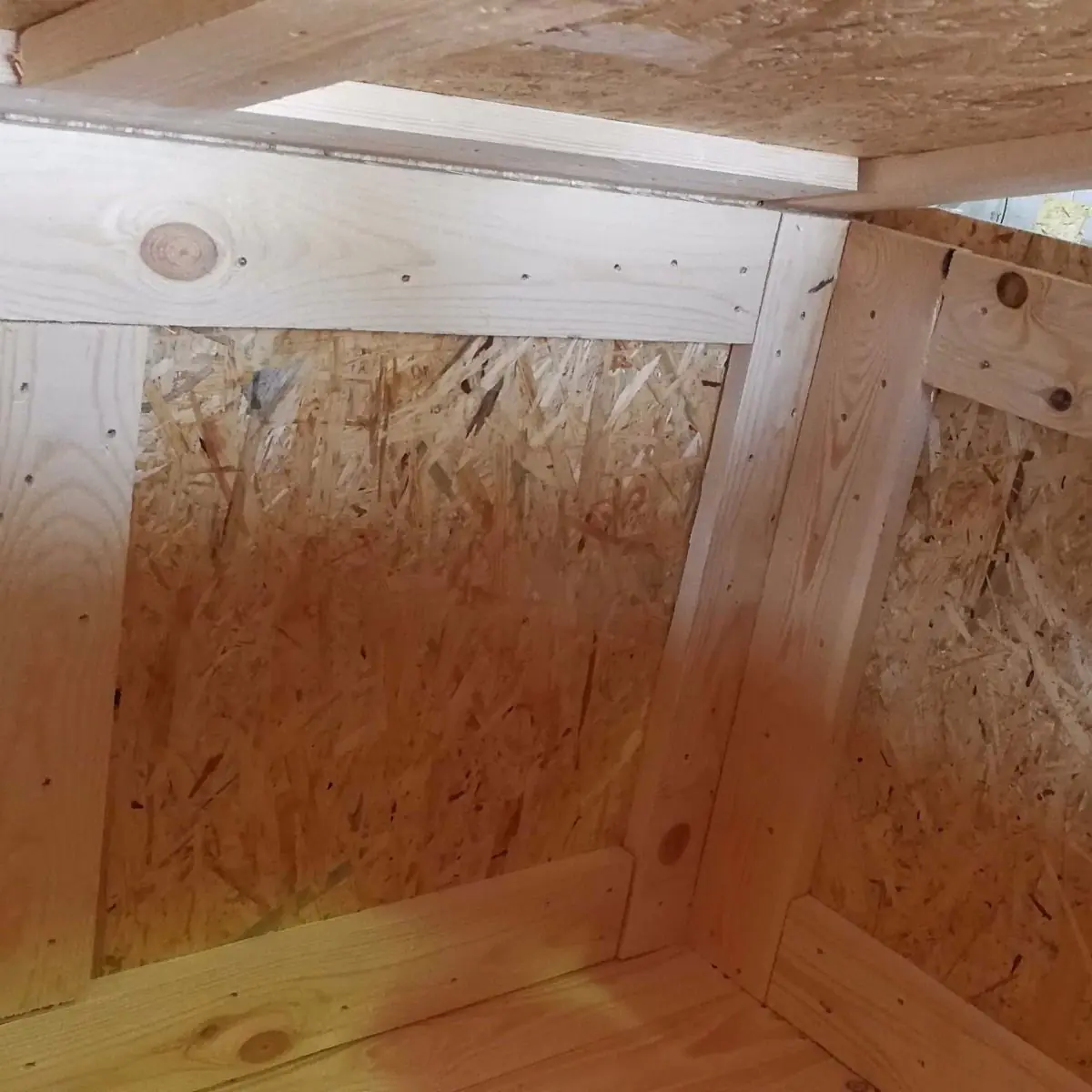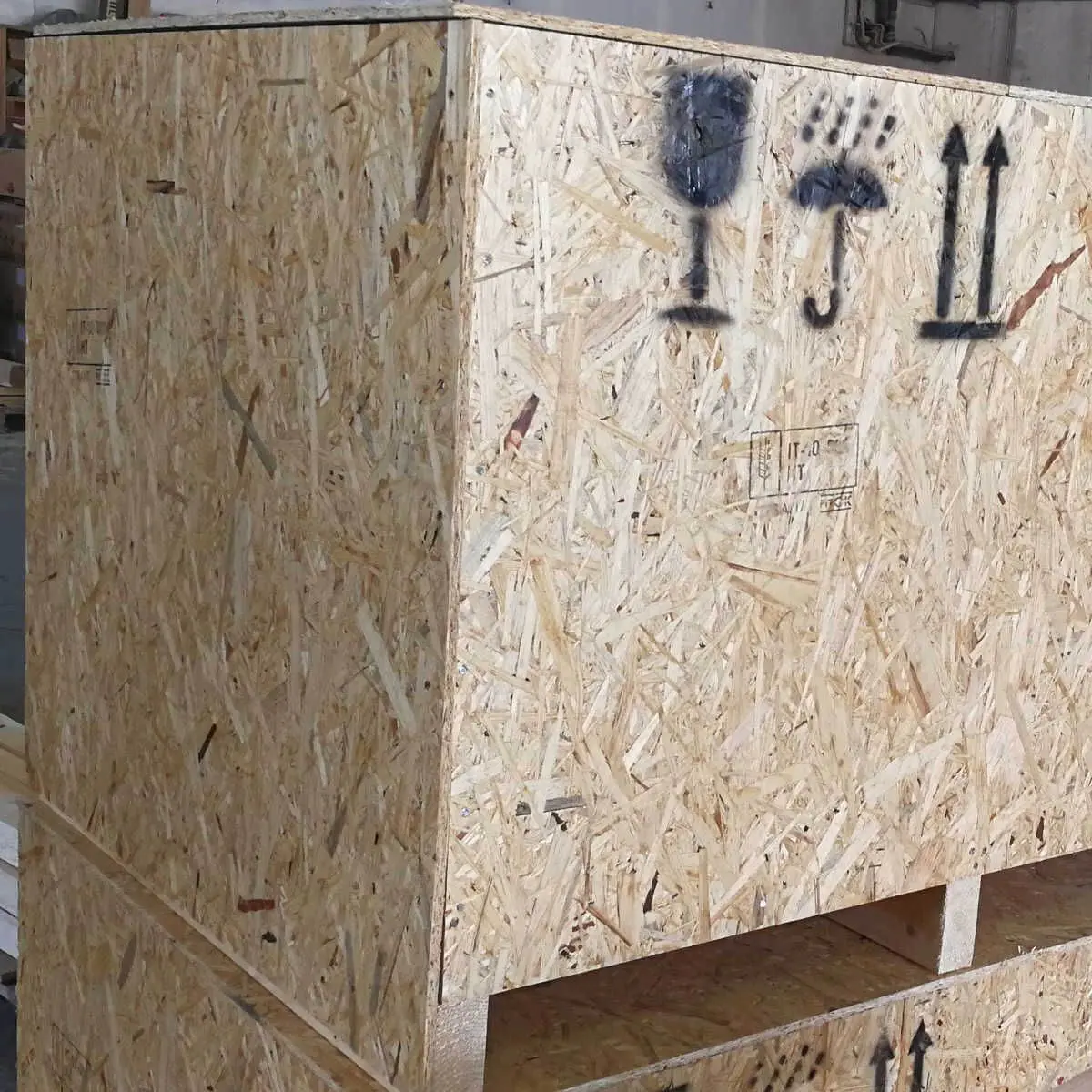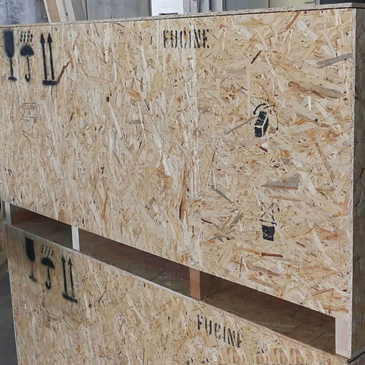 Cassa per trasporto e spedizione in Legno OSB, costruita "su misura". Fondo pallettizzato (bancale) e struttura interna in legno massello rivestita da pannelli OSB. Spessore e struttura variabile in base alle dimensioni richieste e al peso da sopportare.