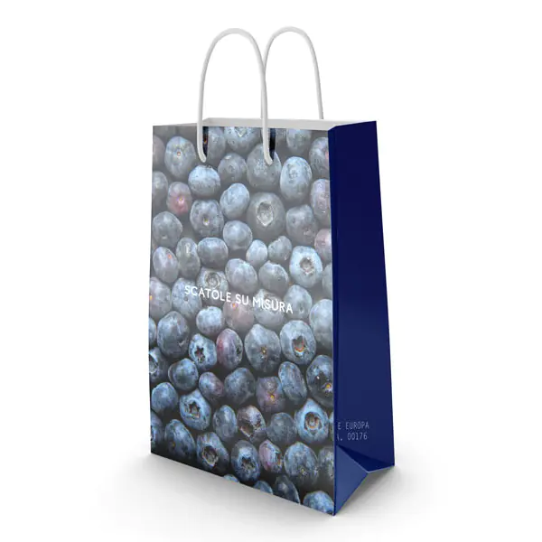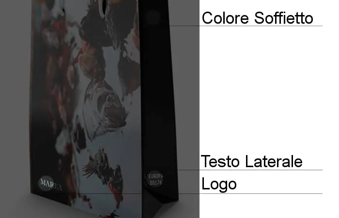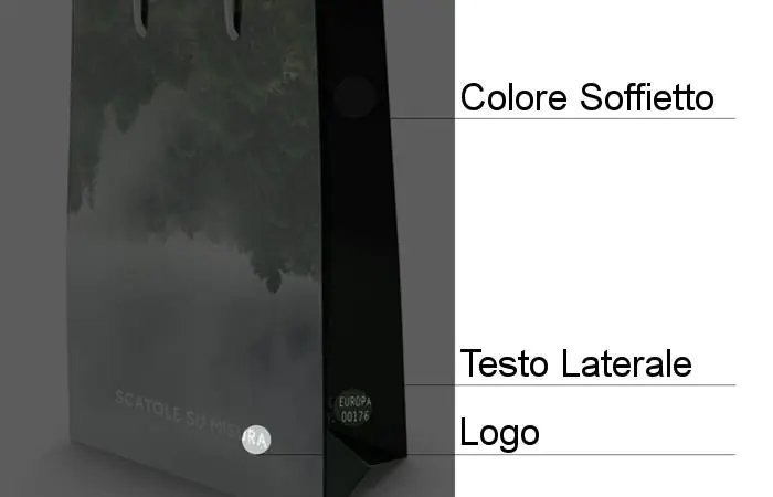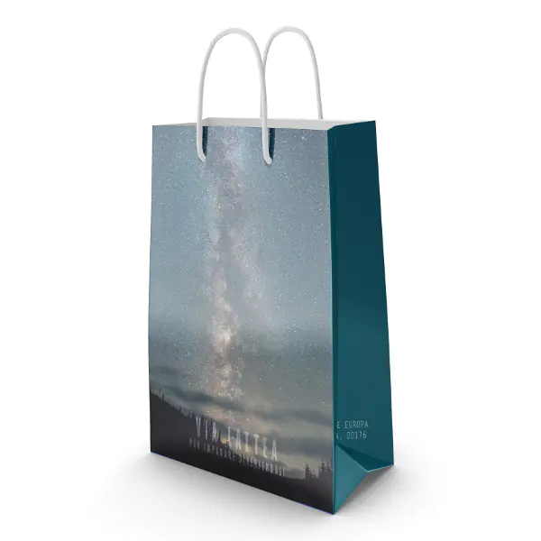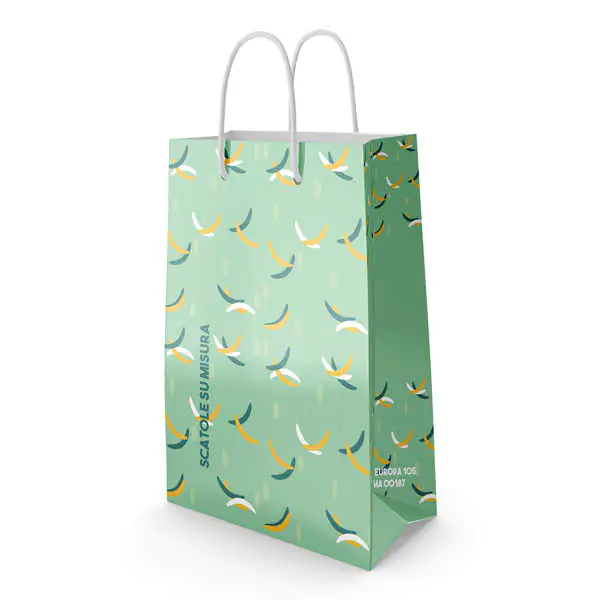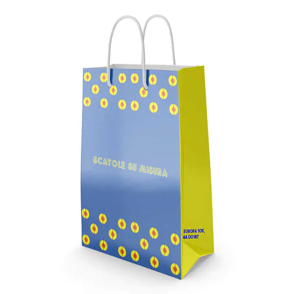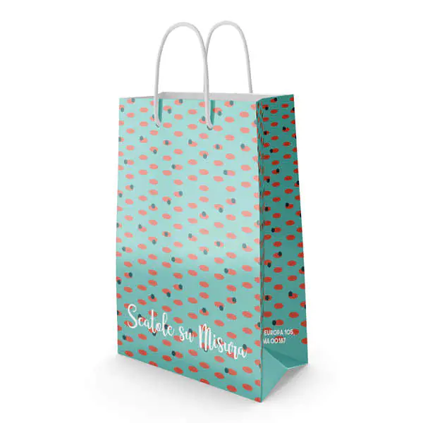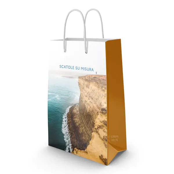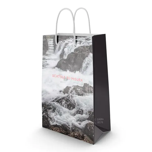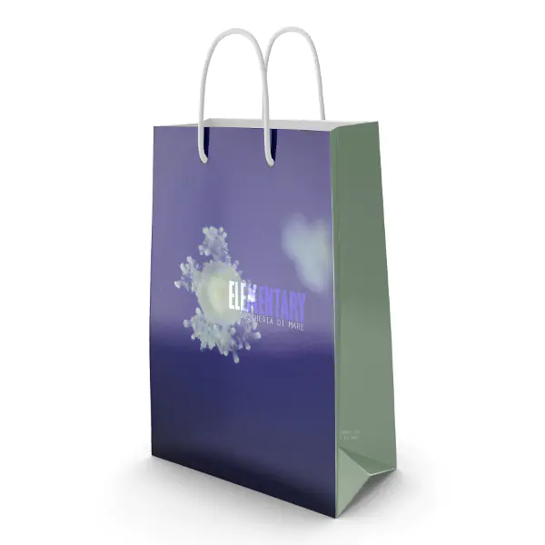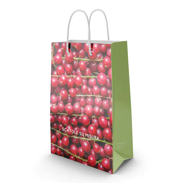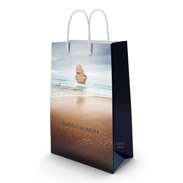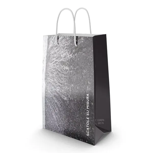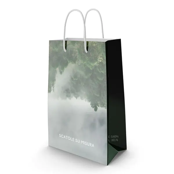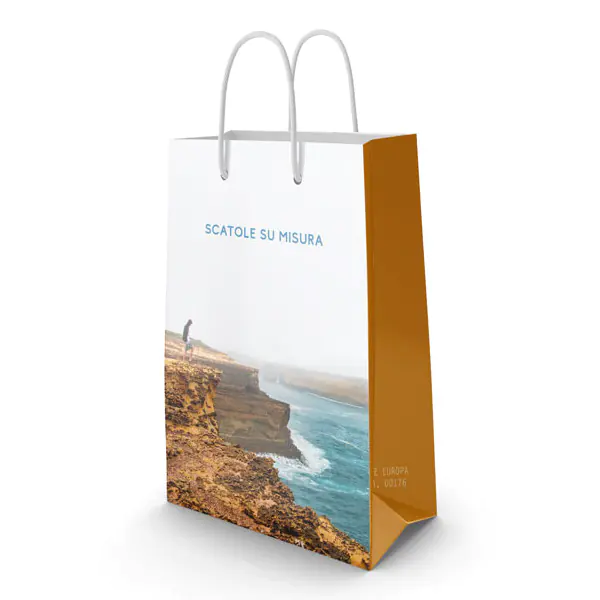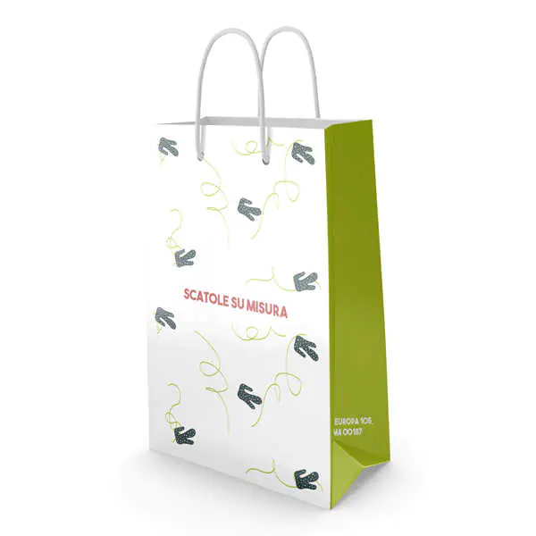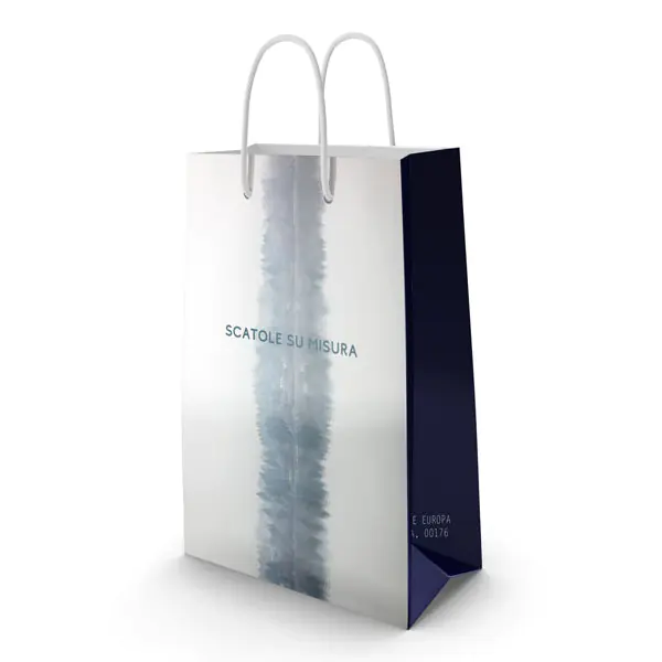 | Materiale | Carta monopatinata da 180 gr/mq plastificata lucida o opaca. Maniglia in cotone con 4 nodi. Rinforzi in cartone sul fondo e sul risvolto. |
