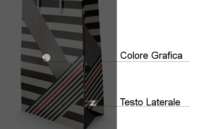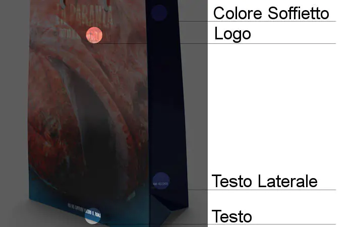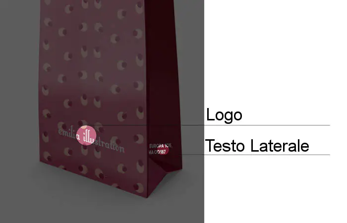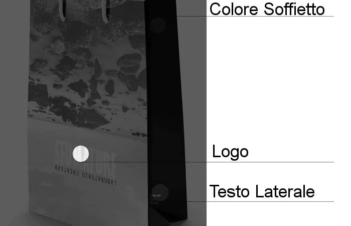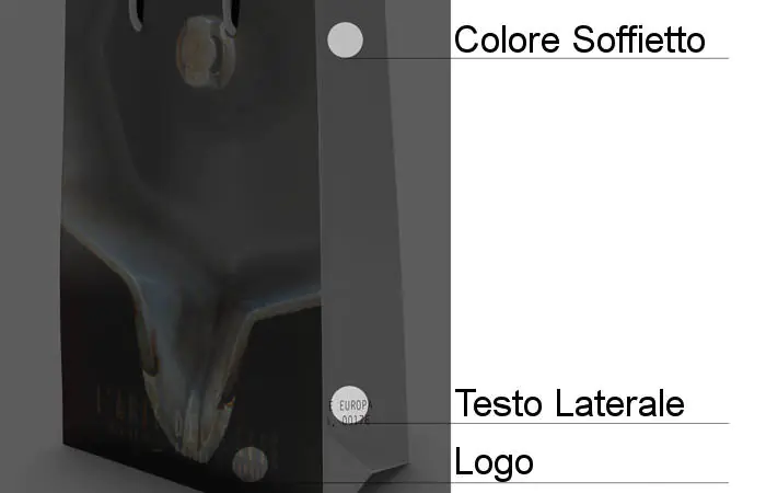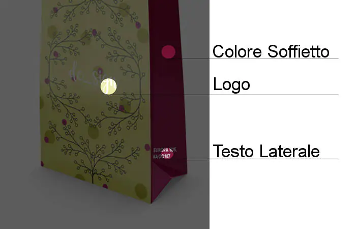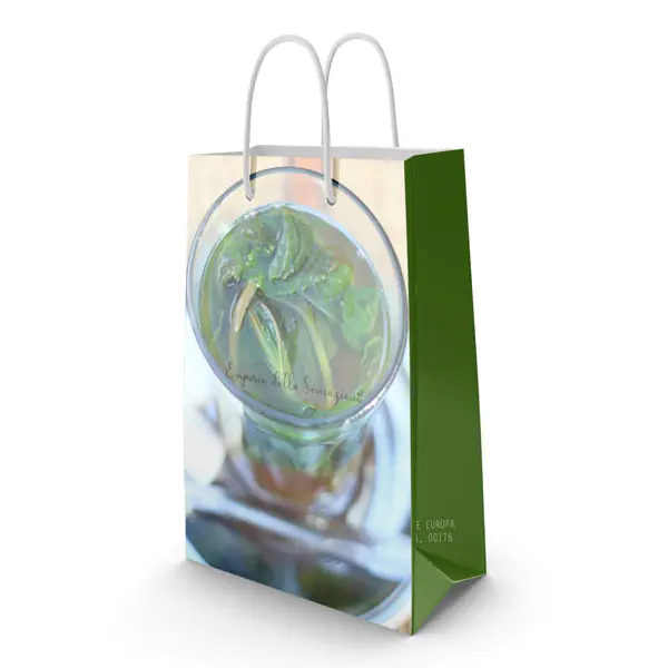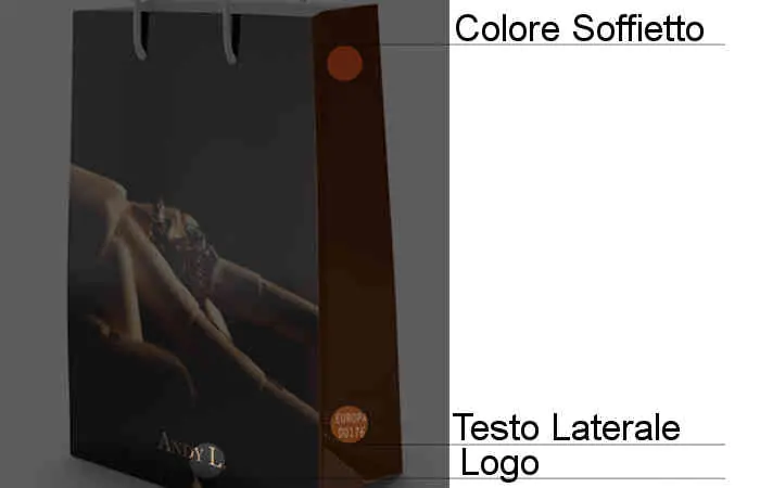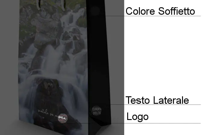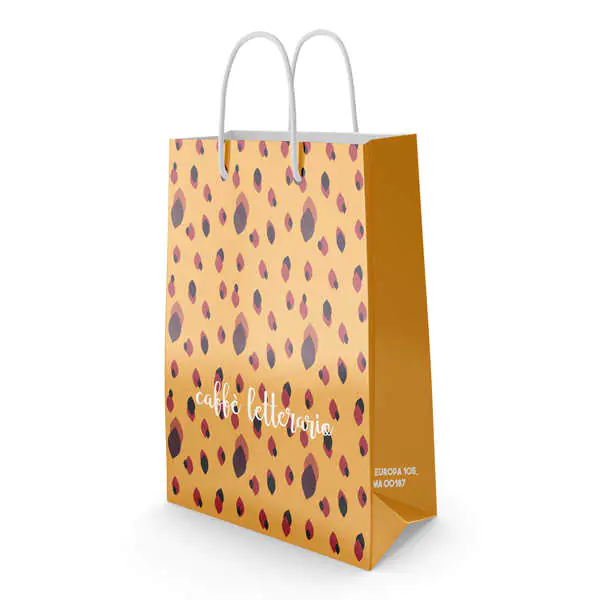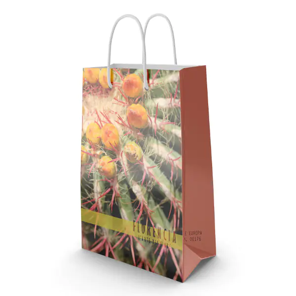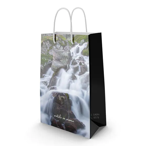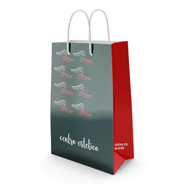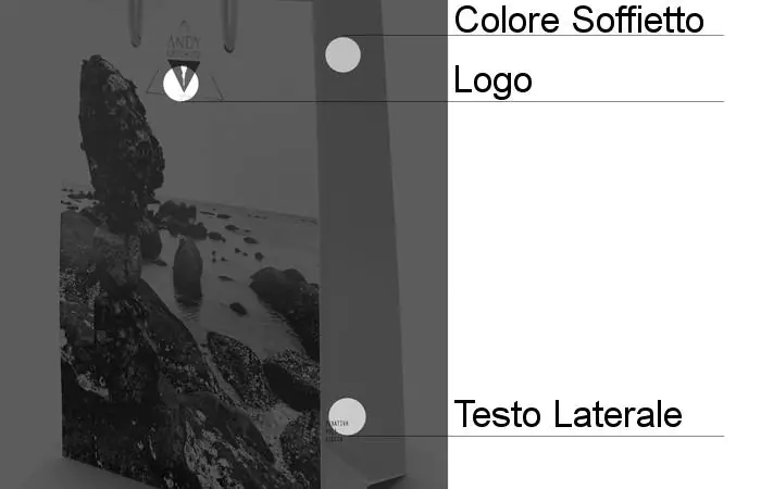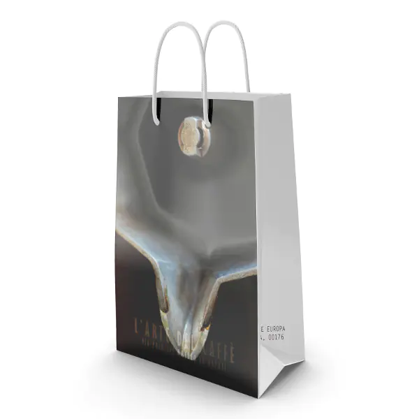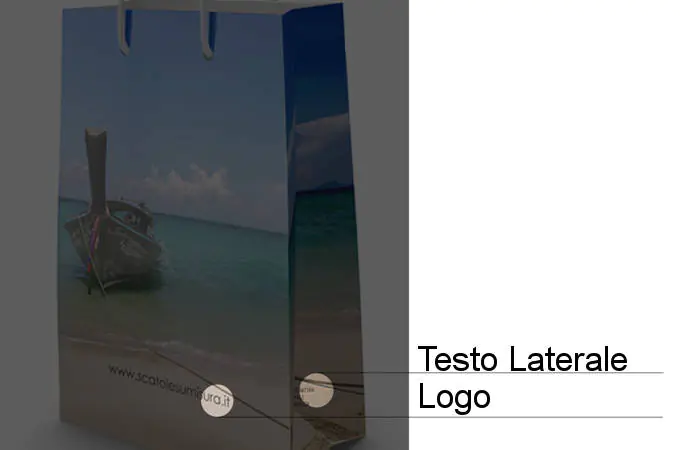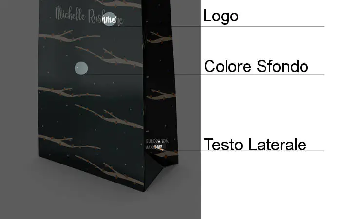 | Materiale | Carta monopatinata da 180 gr/mq plastificata lucida o opaca. Maniglia in cotone con 4 nodi. Rinforzi in cartone sul fondo e sul risvolto. |