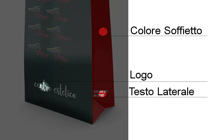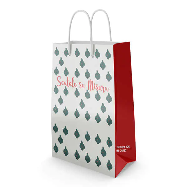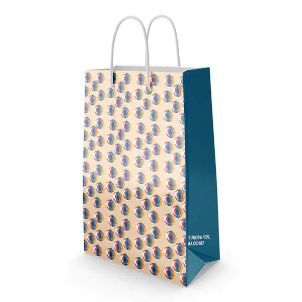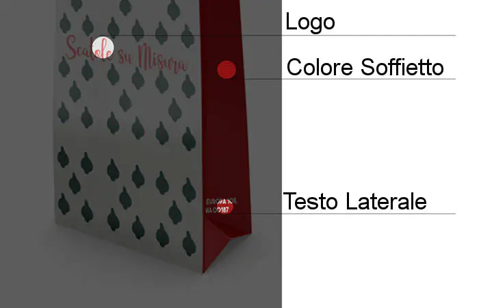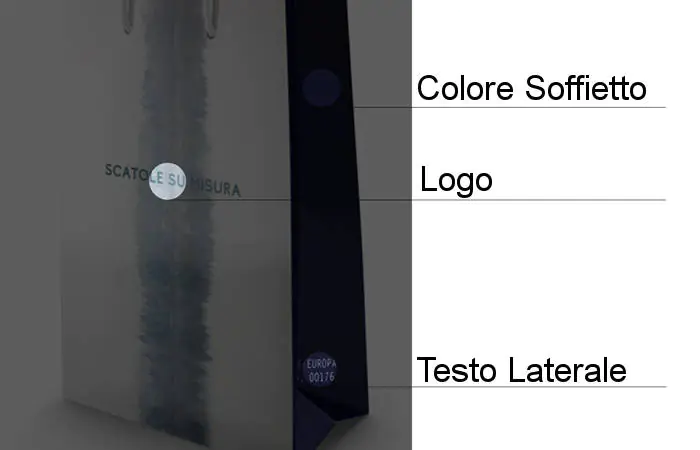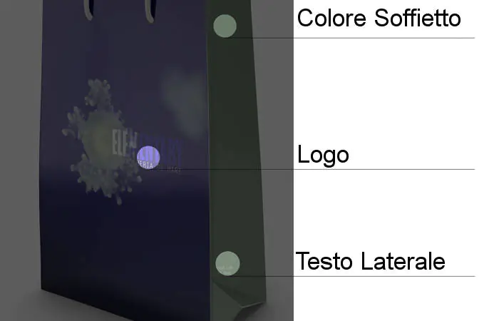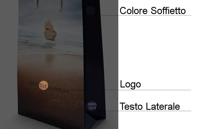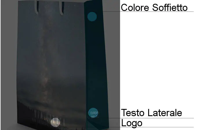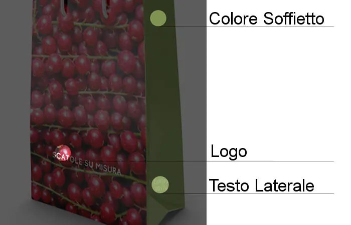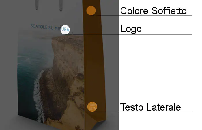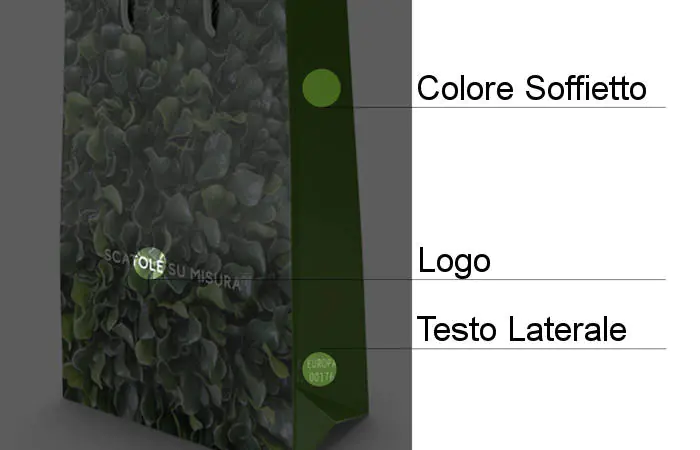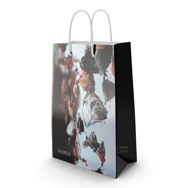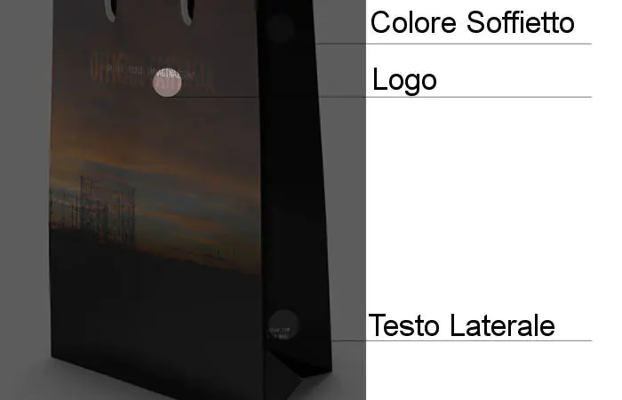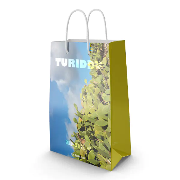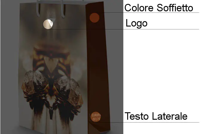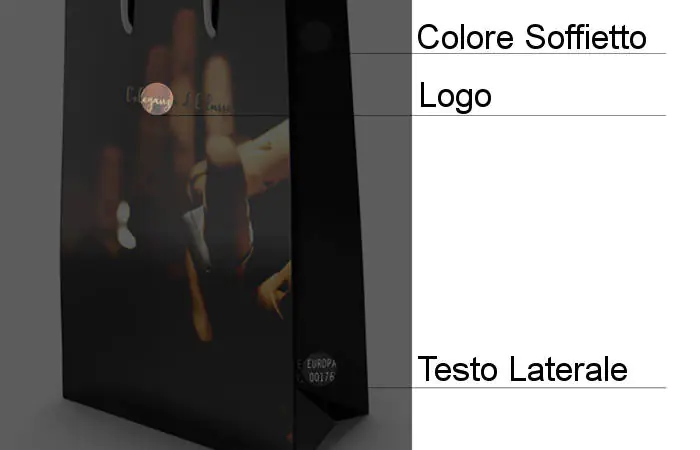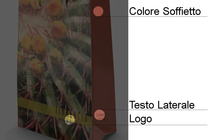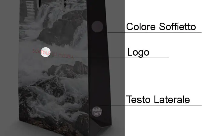 | Materiale | Carta monopatinata da 180 gr/mq plastificata lucida o opaca. Maniglia in cotone con 4 nodi. Rinforzi in cartone sul fondo e sul risvolto. |