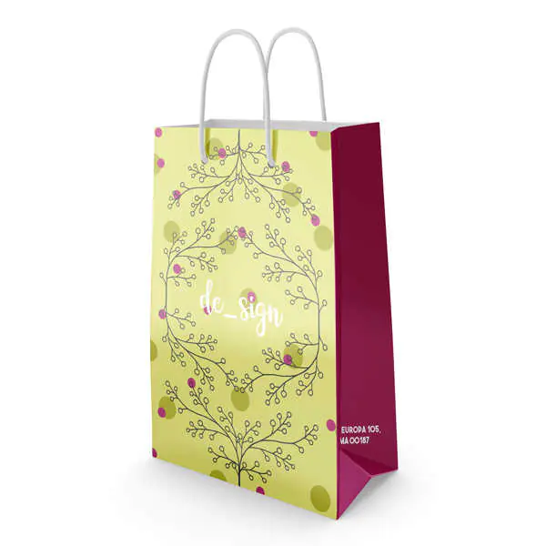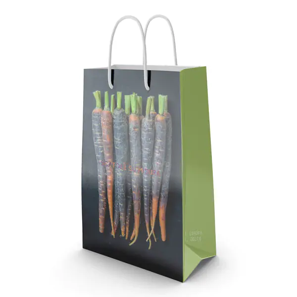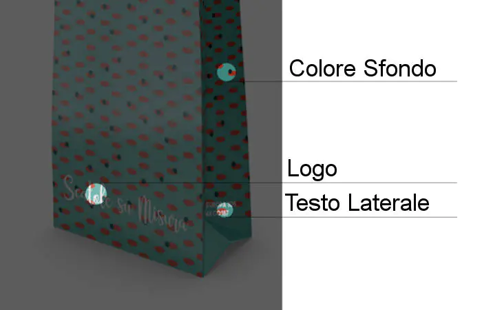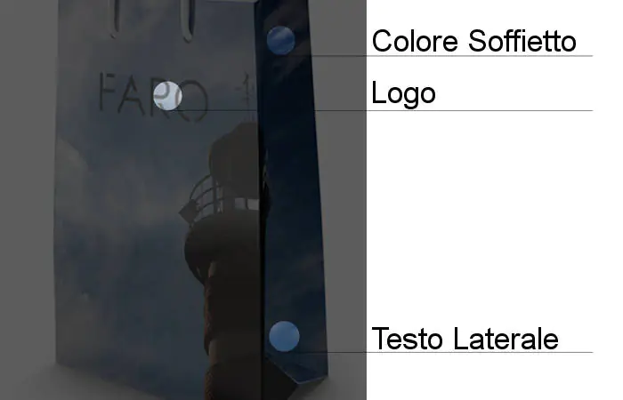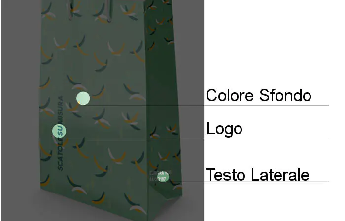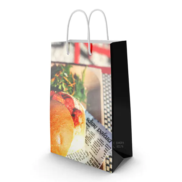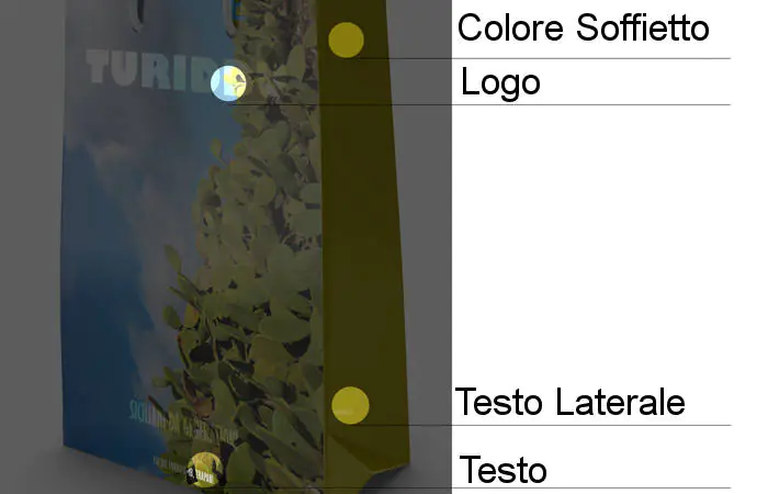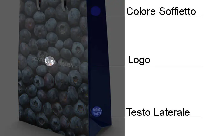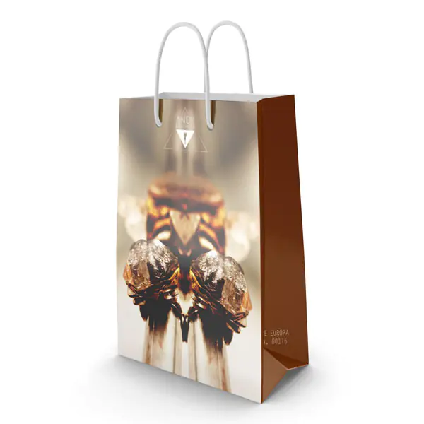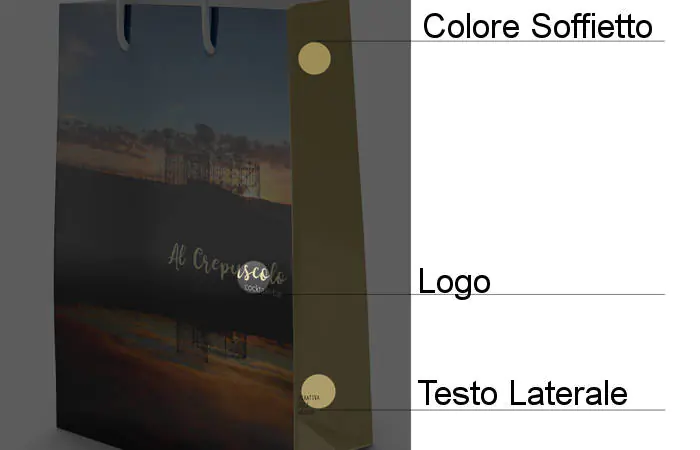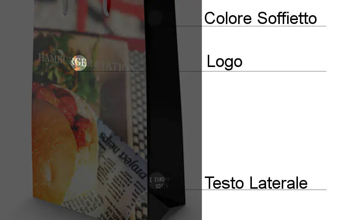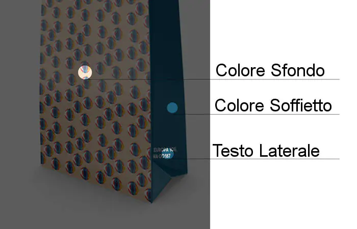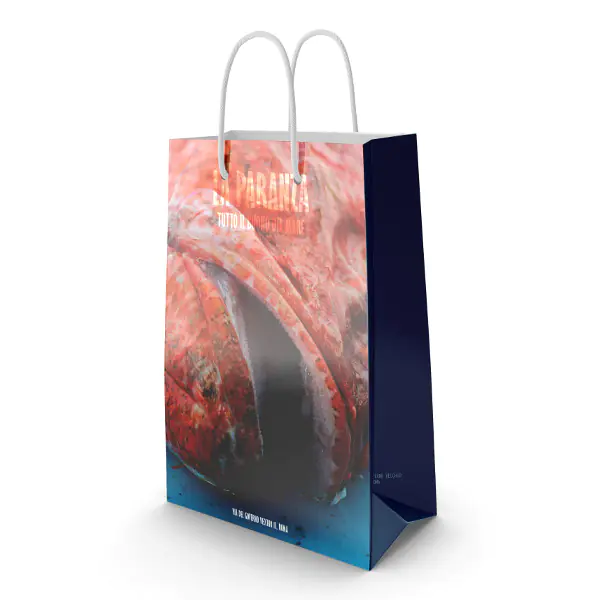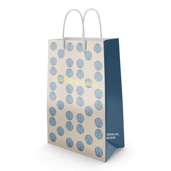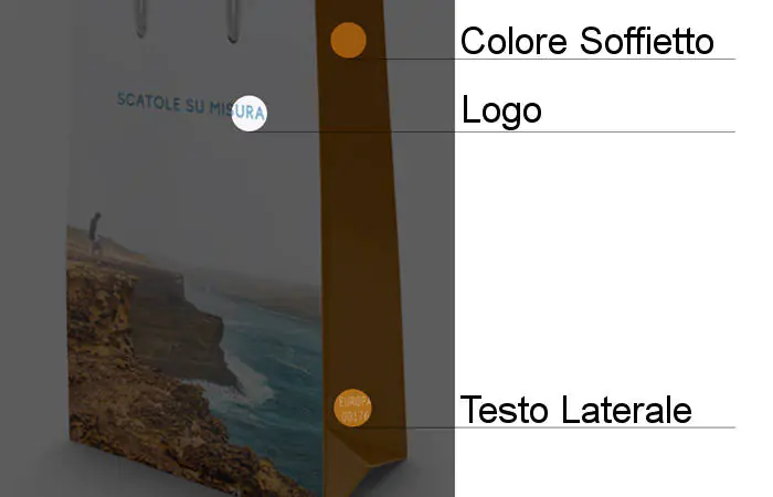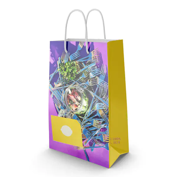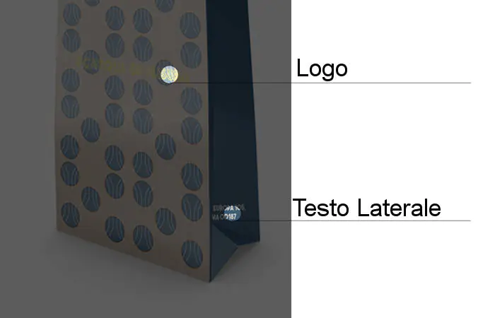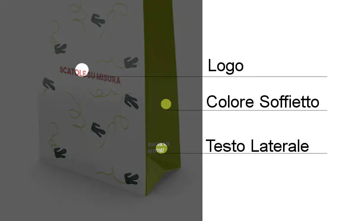 | Materiale | Carta monopatinata da 180 gr/mq plastificata lucida o opaca. Maniglia in cotone con 4 nodi. Rinforzi in cartone sul fondo e sul risvolto. |