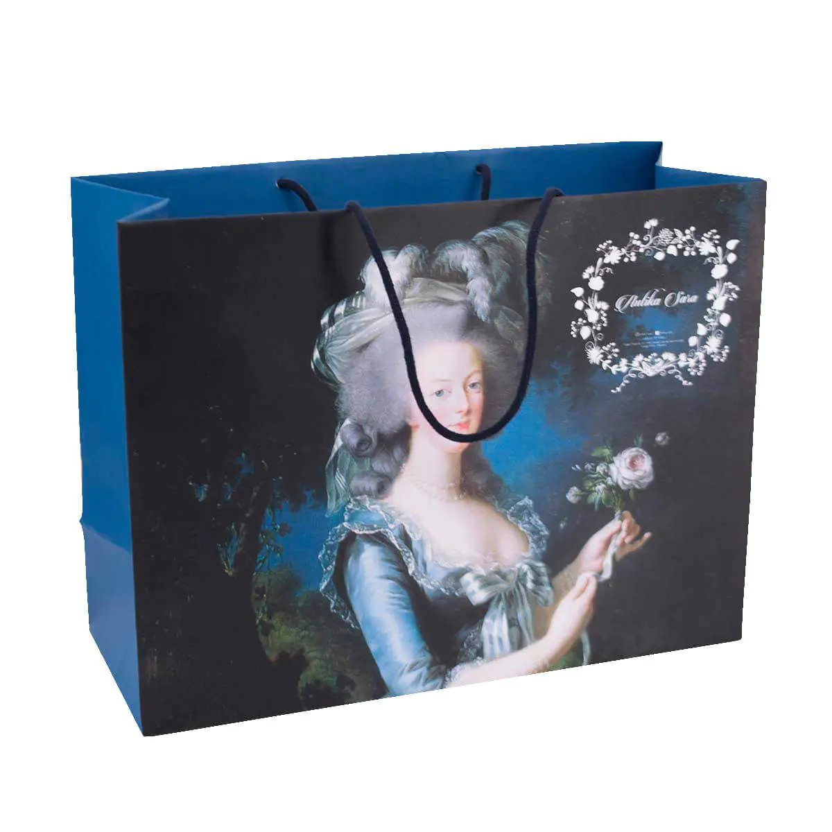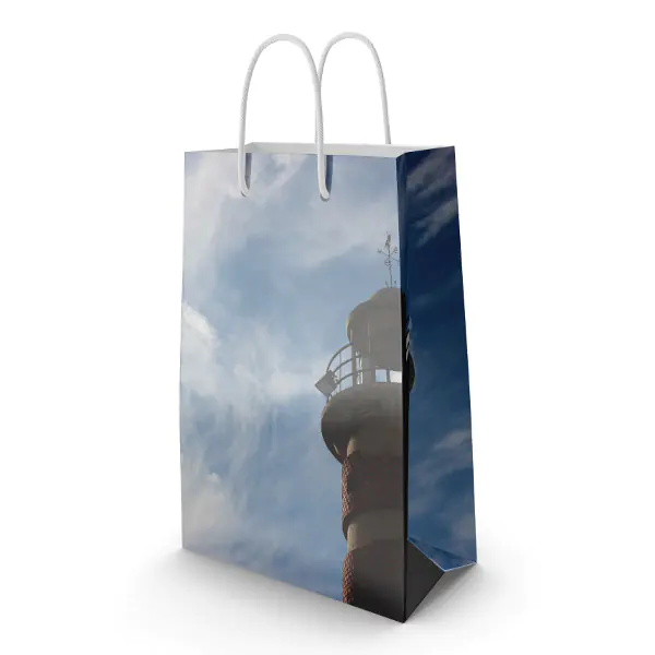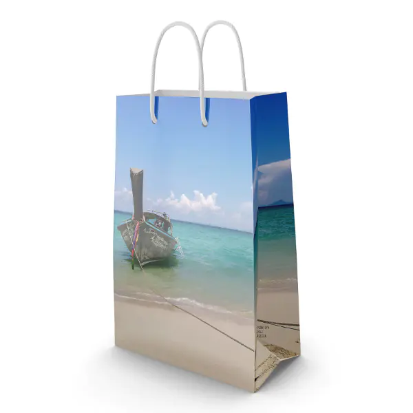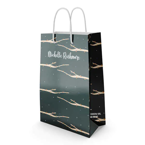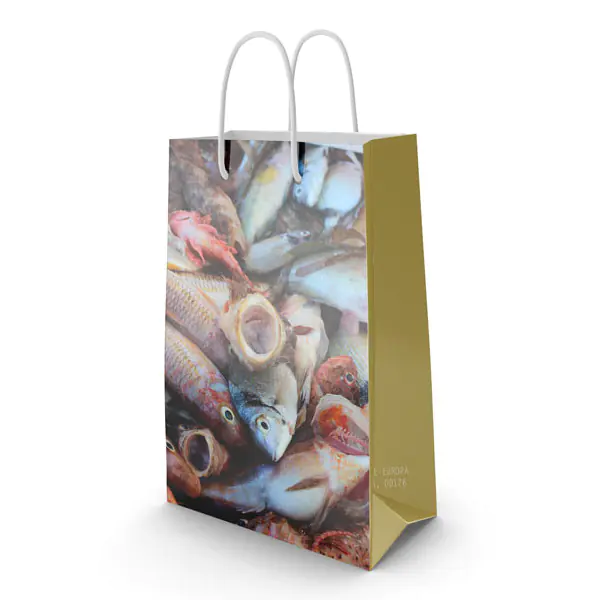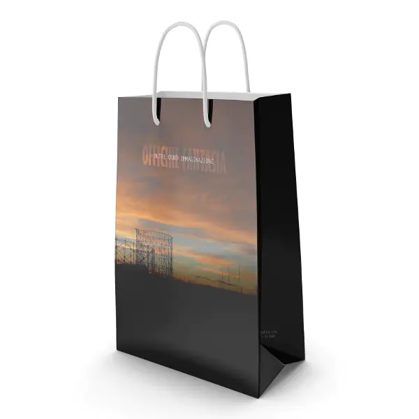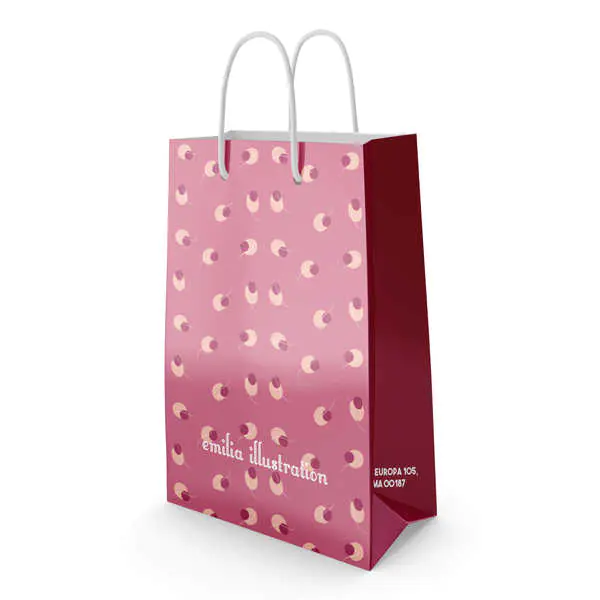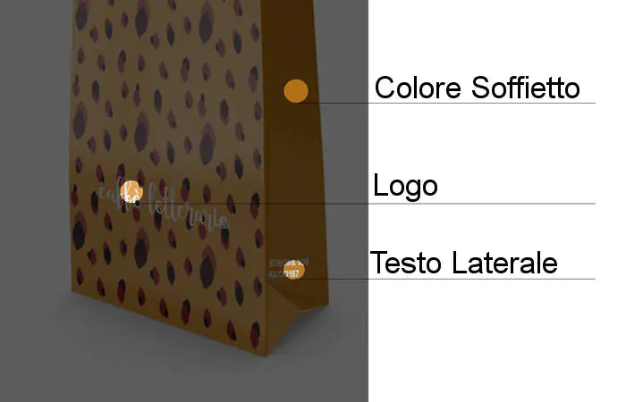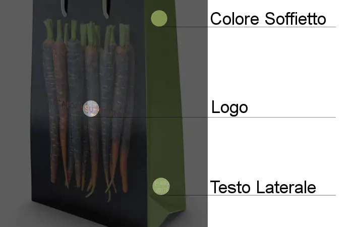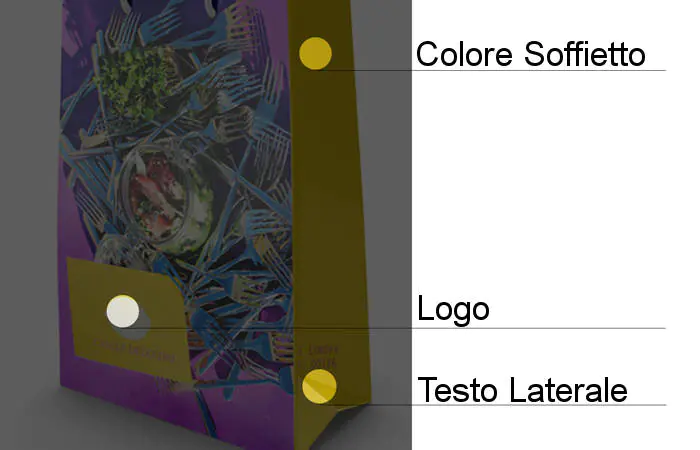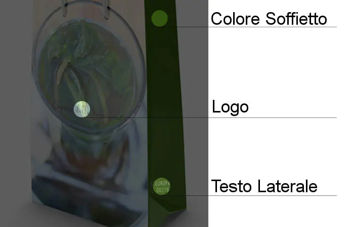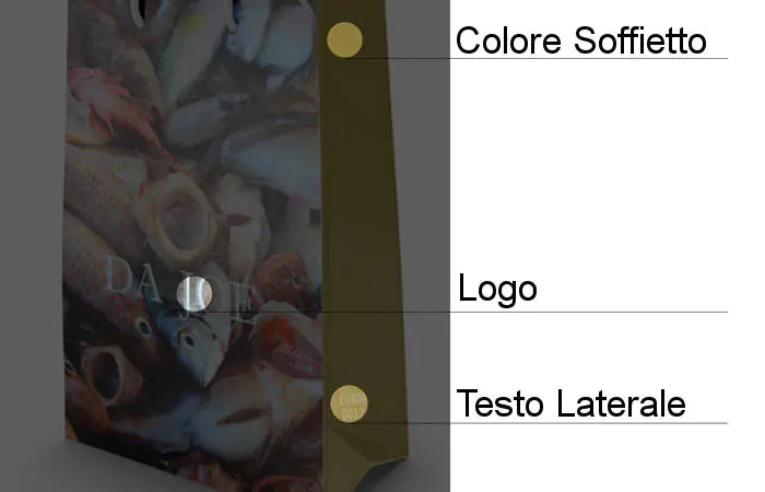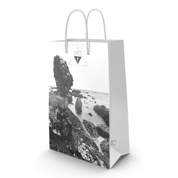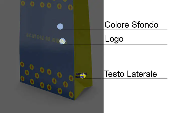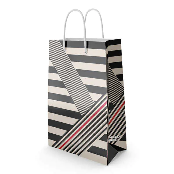 | Materiale | Carta monopatinata da 180 gr/mq plastificata lucida o opaca. Maniglia in cotone con 4 nodi. Rinforzi in cartone sul fondo e sul risvolto. |