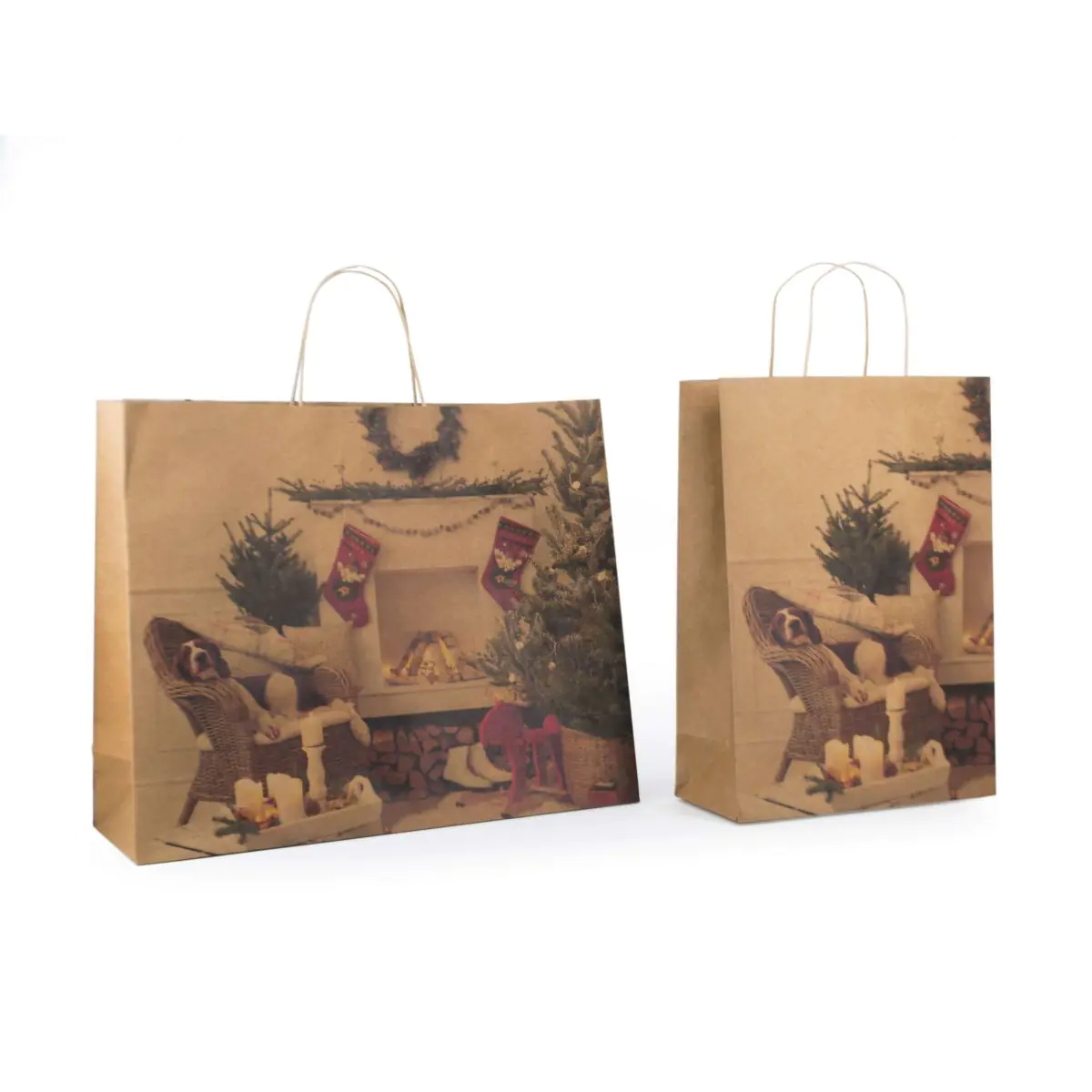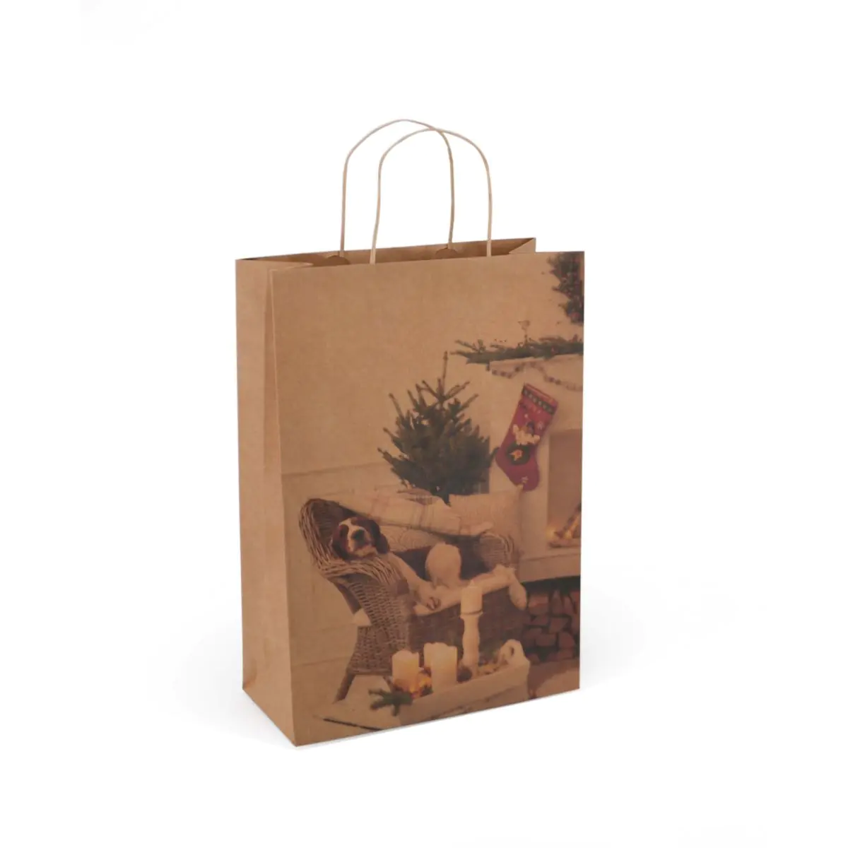Shopper in carta kraft da 110gr. Maniglie patch in carta ritorta. Stampa a colori sulla superficie esterna in tama Natale.